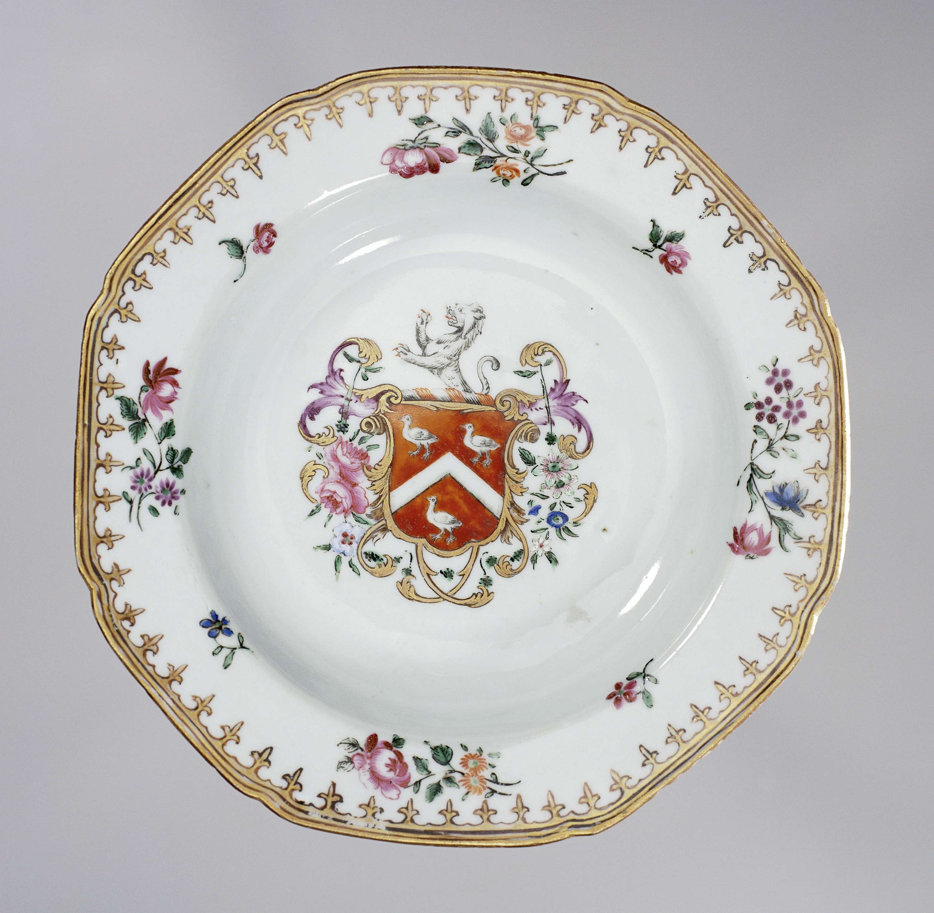 Achtkantig dipe bord met ingenepen hoeken, beschilderd in emails en goud met in het centrum een familiewapen, mogelijk van de familie Sayer. Bloemtakken op de rand, omgeven door een spearhed-band. (Nederlands)