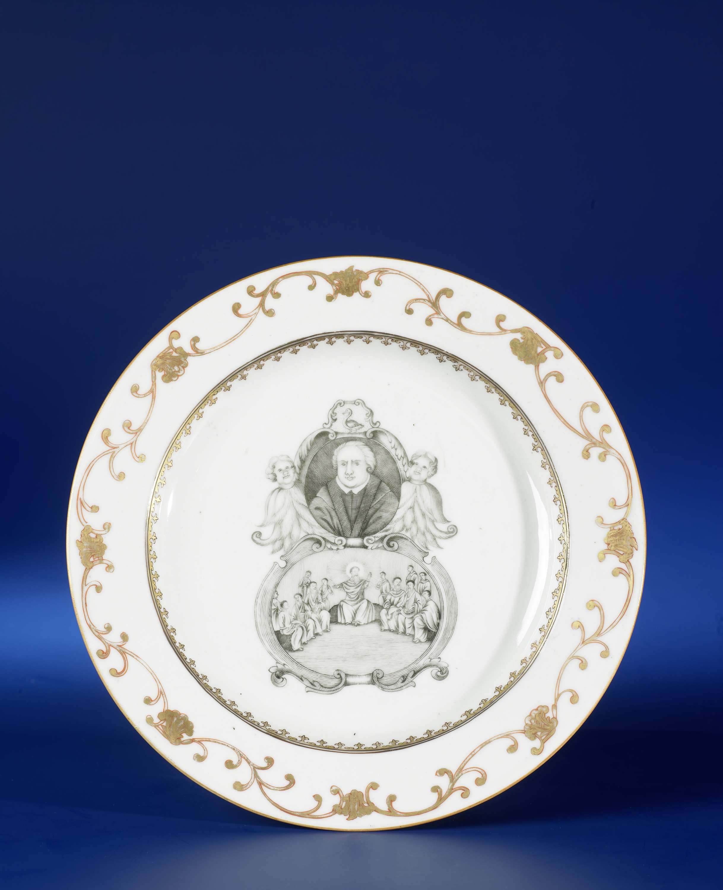 Bord van porselein, beschilderd op het glazuur in rood, zwart en goud. Op het plat een voorstelling van Martin Luther (1483-1546) in een versierd cartouche, waaronder een tweede cartouche met een voorstelling van Christus omringd door zijn discipelen; de wand met een 'spearhead-border'; de rand met een Europese decoratieve band met schelpmotief en ranken. Europese voorstelling in encre de Chine. (Nederlands)