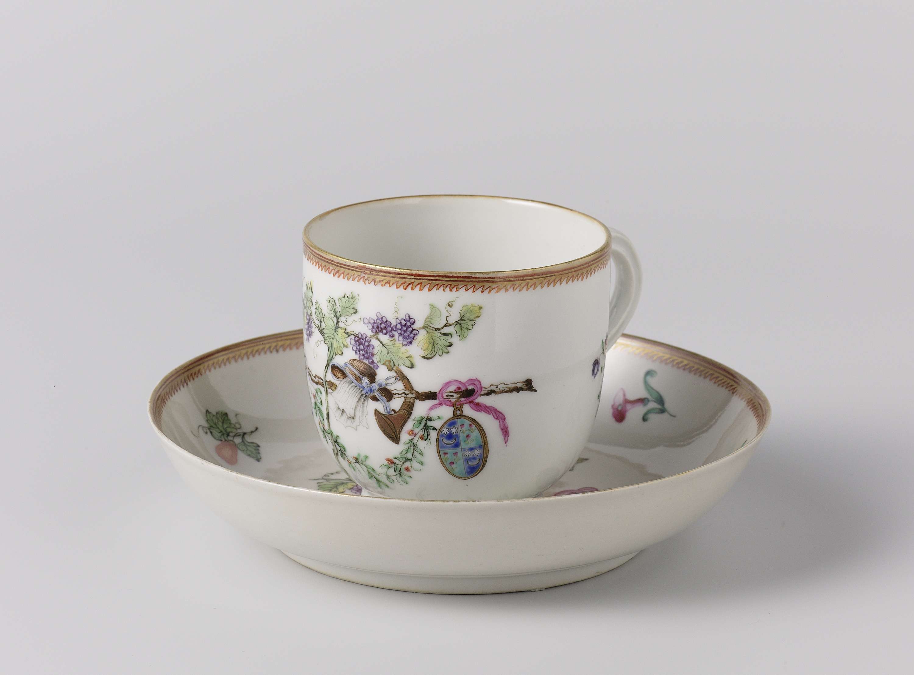 Oorkop en schotel van porselein, beschilderd op het glazuur in blauw, rood, roze, groen, geel, paars, zwart en goud. Op het plat van de schotel in het centrum een druiventak en een stok waaraan een hoed, een blad papier, een hoorn en twee wapenschilden zijn bevestigd, tussen de schilden een guirlande; op de wand zes bloemtakken; de binnenrand met een decoratief patroon. De wapenschilden zijn van de families Visvliet en Sluymer (Zeeland). De kop met dezelfde decoratie. Wapenporselein. (Nederlands)