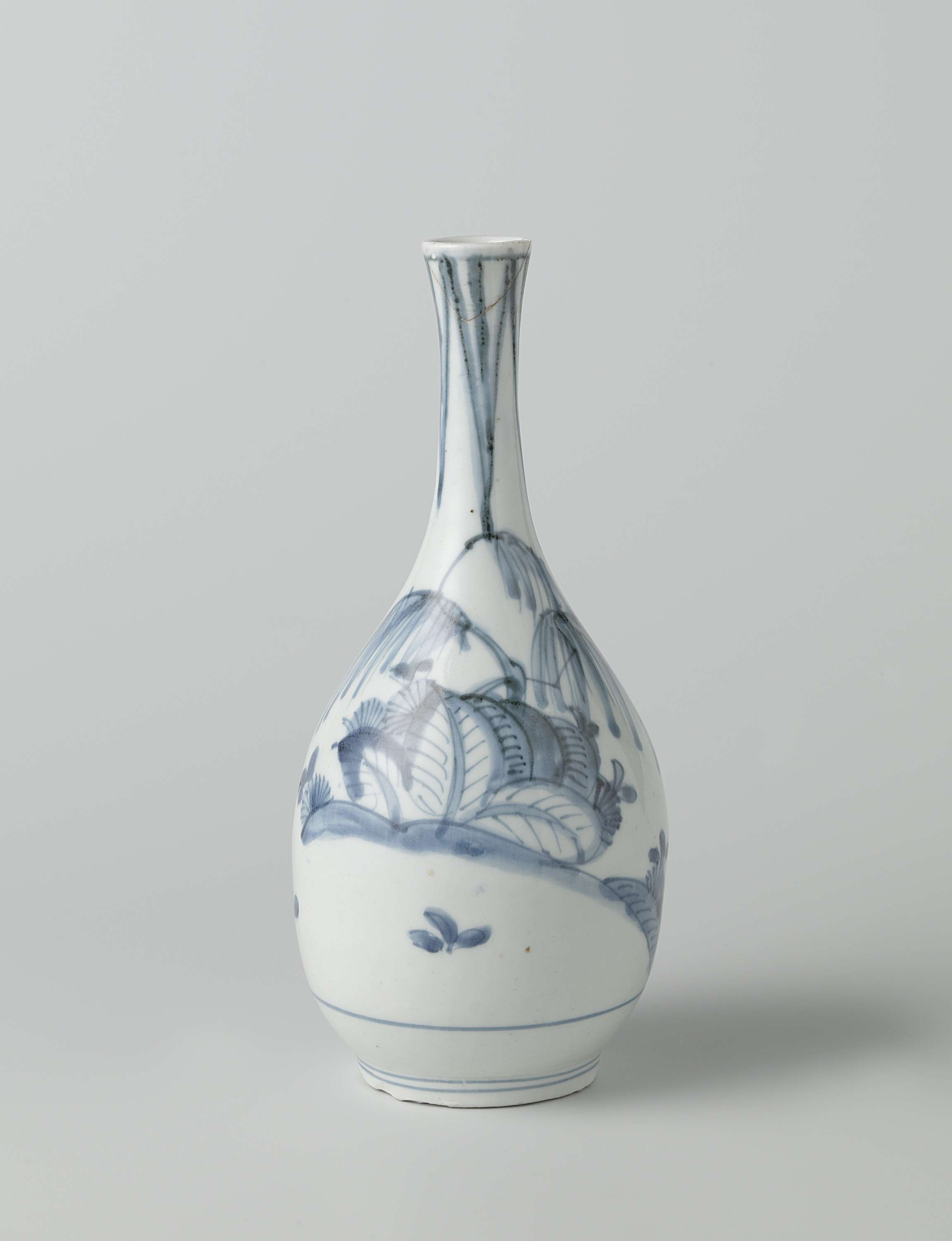 Rozenwaterfles van porselein met peervormig lichaan en smalle, iets uitlopende nek, beschilderd in onderglazuur blauw. Op de wand planten met grote bladeren en een boom. Op de nek afhangende, puntige bladmotieven vanuit de rand. Rand is gebroken geweest. Voetring gechipt. Arita, blauw-wit. (Nederlands)