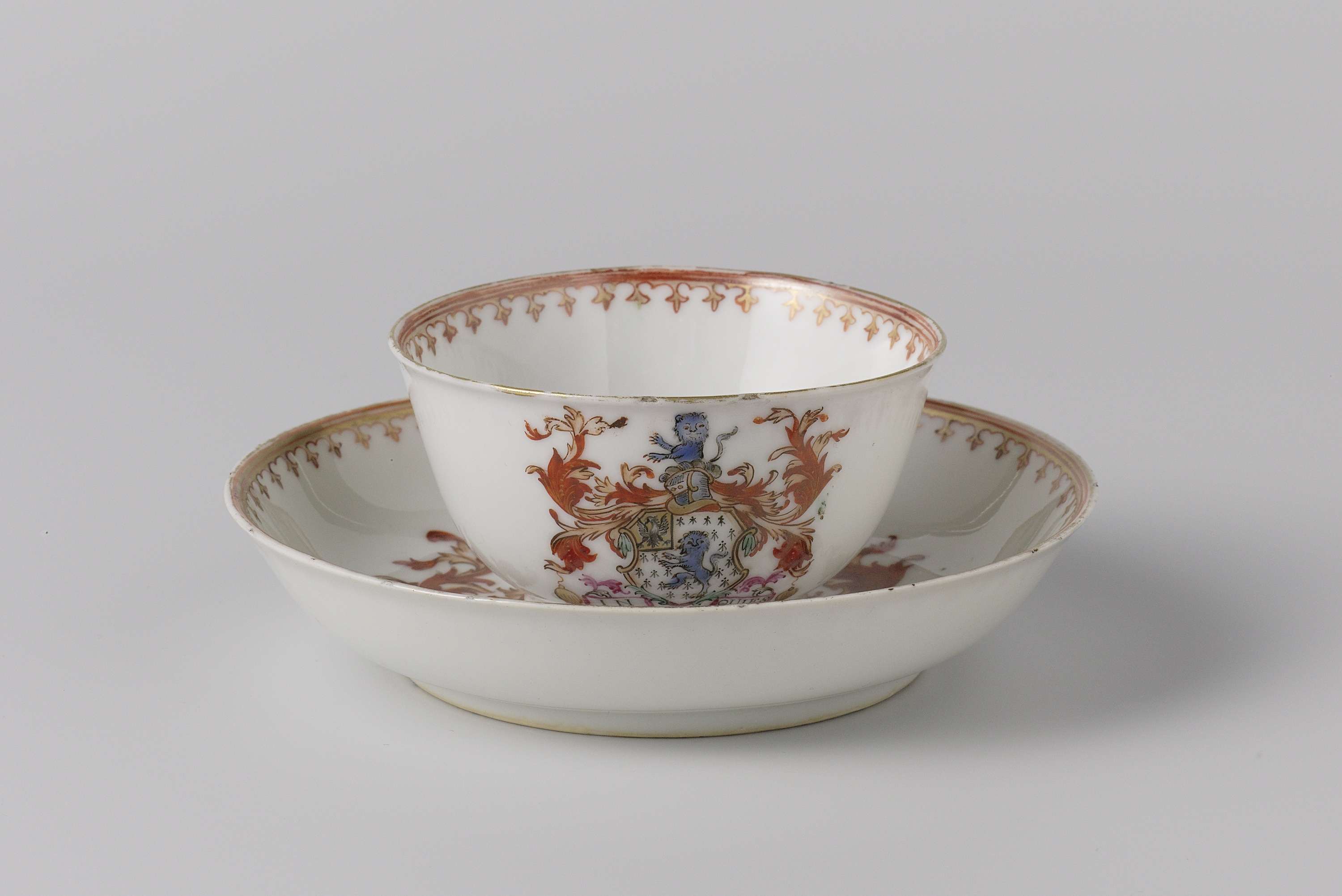 Klokvormige kop en schotel, beschilderd in emails en goud met het wapen van de familie Edwards uit Norfolk en een smalle dcoratieve band. (Nederlands)
