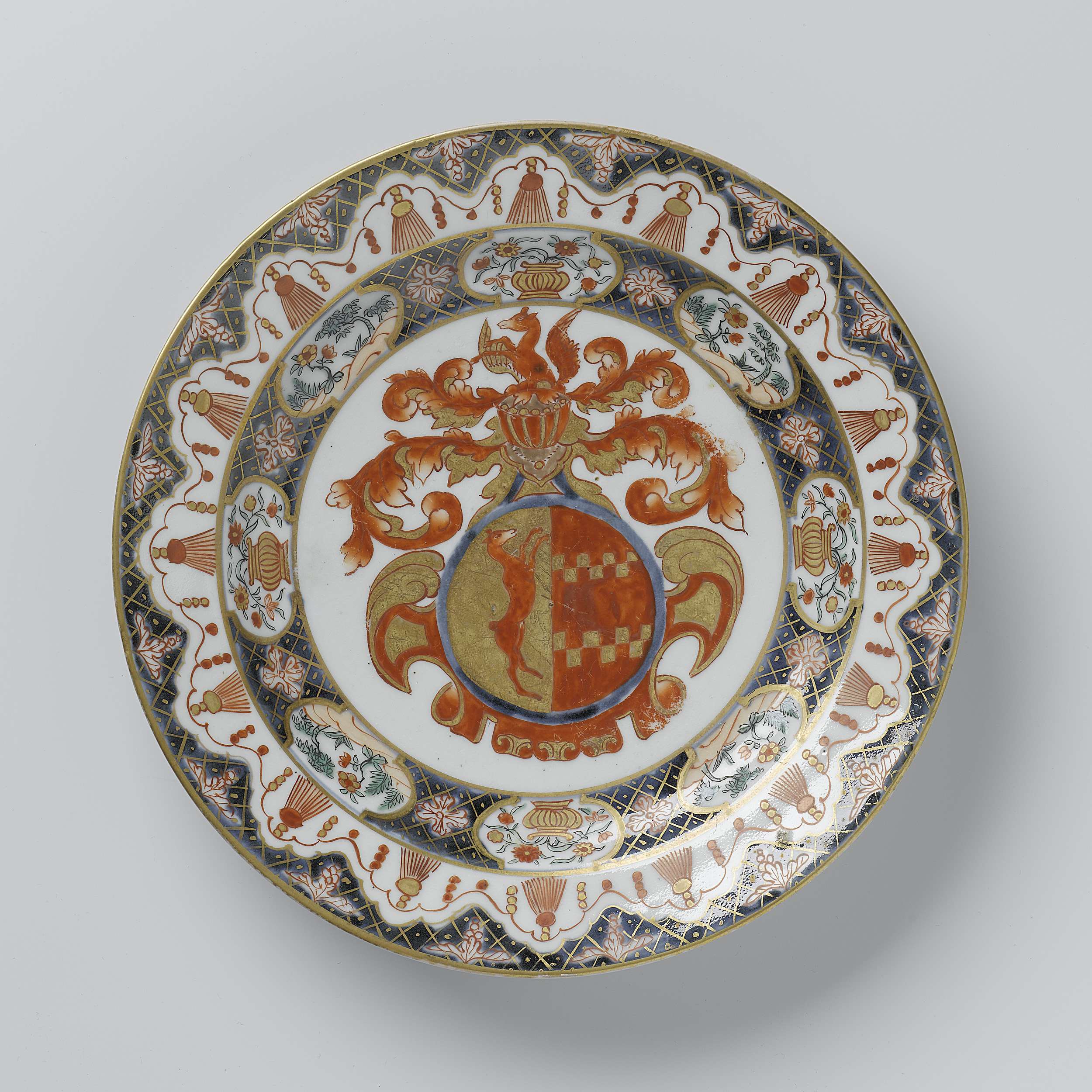 Bord van porselein, beschilderd in onderglazuur blauw en op het glazuur rood, groen, zwart en goud. Op het plat het familiewapen van Van Buren met links een windhond tegen een gouden achtergrond en rechts twee keer zeven gouden rechthoeken op een rode achtergrond. Het helmteken is een windhond met vleugels omgeven door acanthusbladeren. De wand met servetwerk met een gestileerde bloem, onderbroken door cartouches met een landschap of een bloemenvaas. De rand met een band met kwasten en een band met bladeren op servetwerk. Vier proenen op de onderzijde. Wapenporselein in Imari. Arita. (Nederlands)