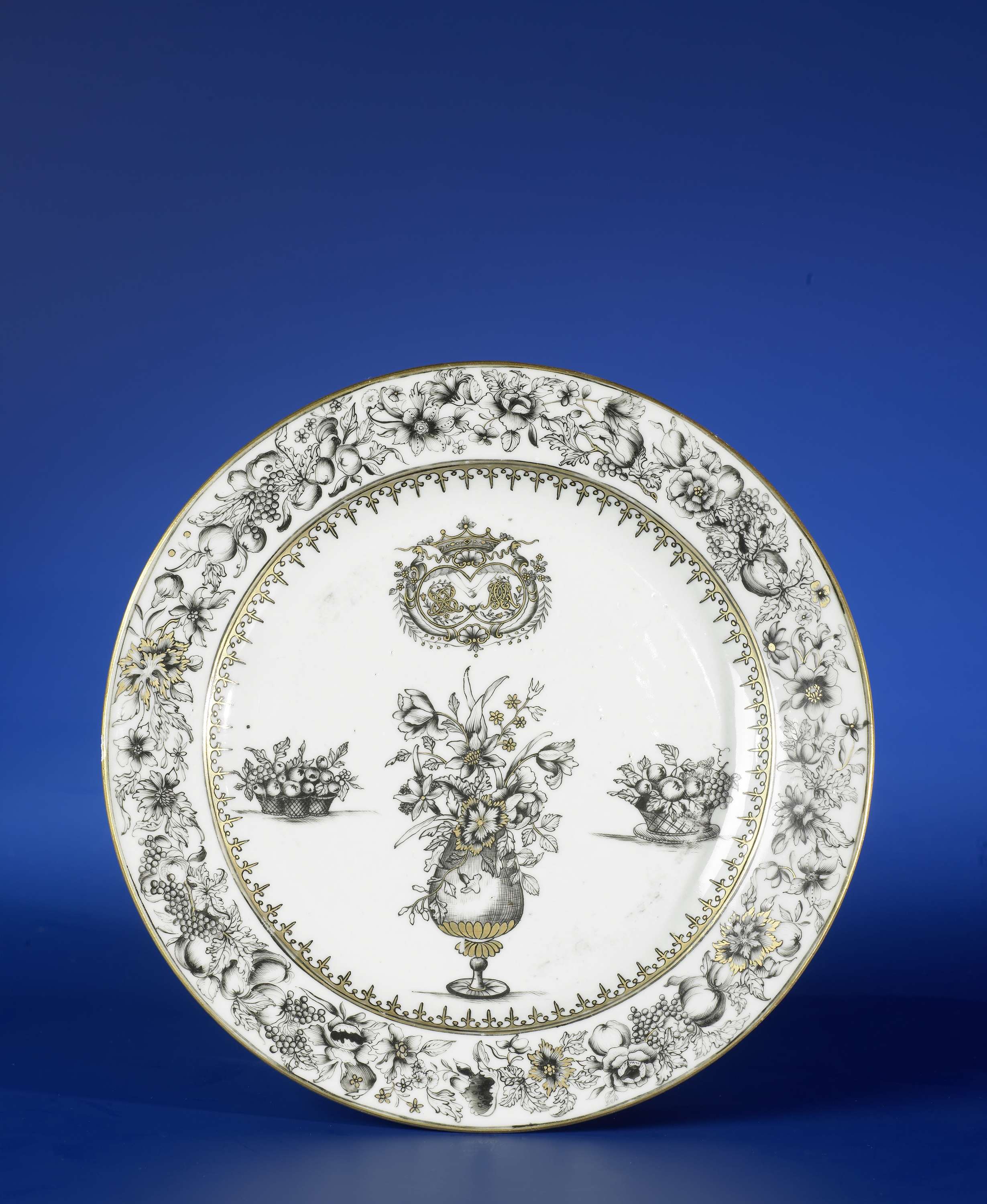 Bord van porselein, beschilderd op het glazuur in zwart en goud. Op het plat een bloemenvaas met aan weerszijden een fruitmand, boven de vaas een gekroond cartouche versierd met twee ineengeslagen handen, bloemtakken, schelpmotieven en guirlandes met het monogram'GB' en het initiaal 'A'; de wand met een 'spearhead-border'; op de rand een band met bloem- en fruittakken. Een chip in de rand. Oud label op de onderzijde met 'Comte de Mercy d'Argenteau/ Paris-Luik/ In 1776 onder Louis XVI'. Europese voorstelling in encre de Chine. (Nederlands)