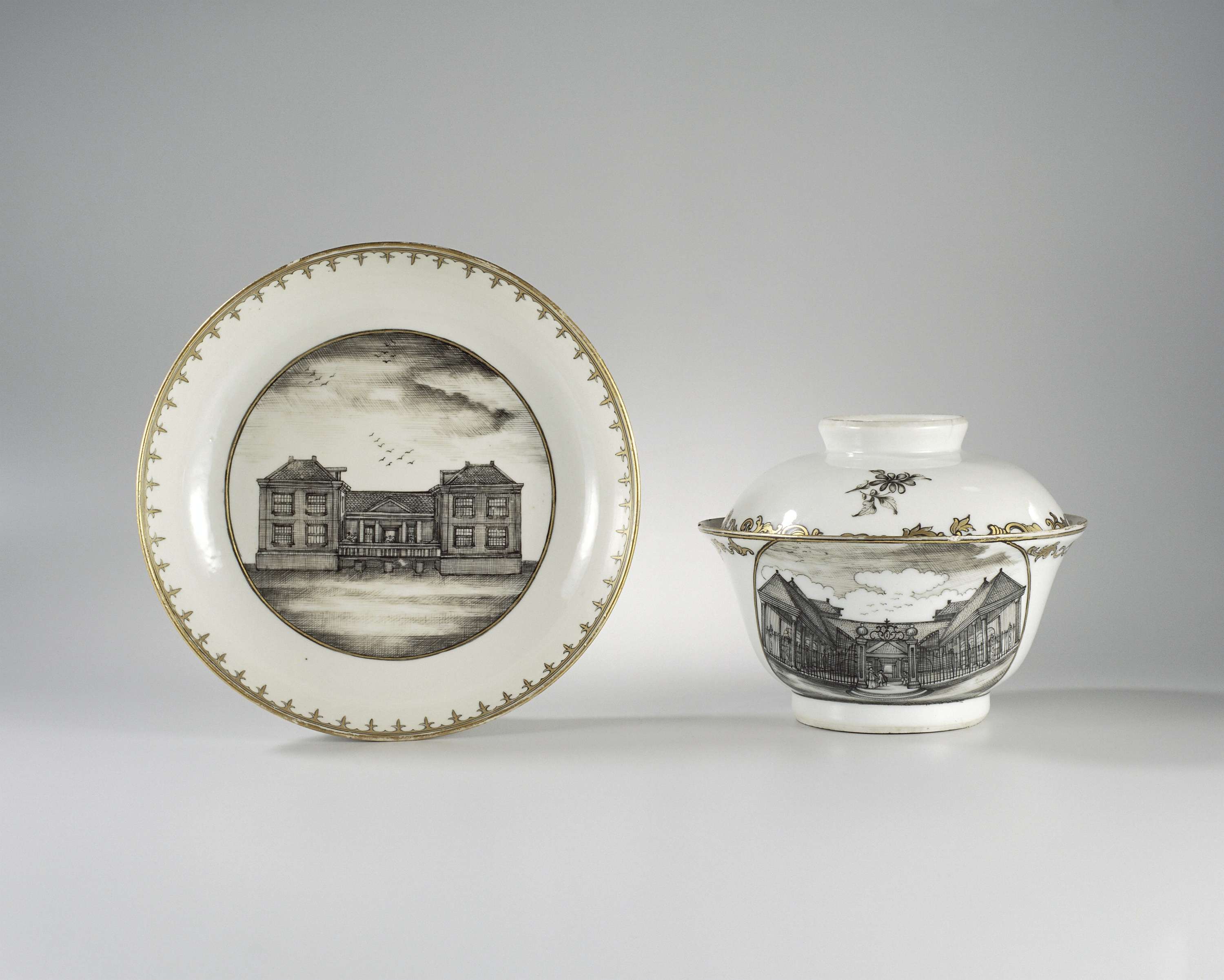 Suikerpot met een uitlopende wand, een gewelfd deksel met een platte ringknop. Een platte schotel op een lage voetring, beide gedecoreerd in encre de Chine en goud met aan de voor- en achterzijde van de pot een voorstelling van de nieuwe graanbeurs in Amsterdam. De schotel heeft een smalle 'spearhed-border', de kom bloemranken langs de rand. De gravure van de nieuwe graanbeurs te Amsterdam werd vervaardigd door Bernardus Maurik en gepubliceerd in het juli-september nummer van de De Maandelijkse Nederlandse Mercurius in 1768. De randdecoratie van de beide onderdelen verschillen van elkaar. Het is dus zeer onwaarschijnlijk dat deze twee stukken oorspronkelijk bij elkaar hoorden. (Nederlands)