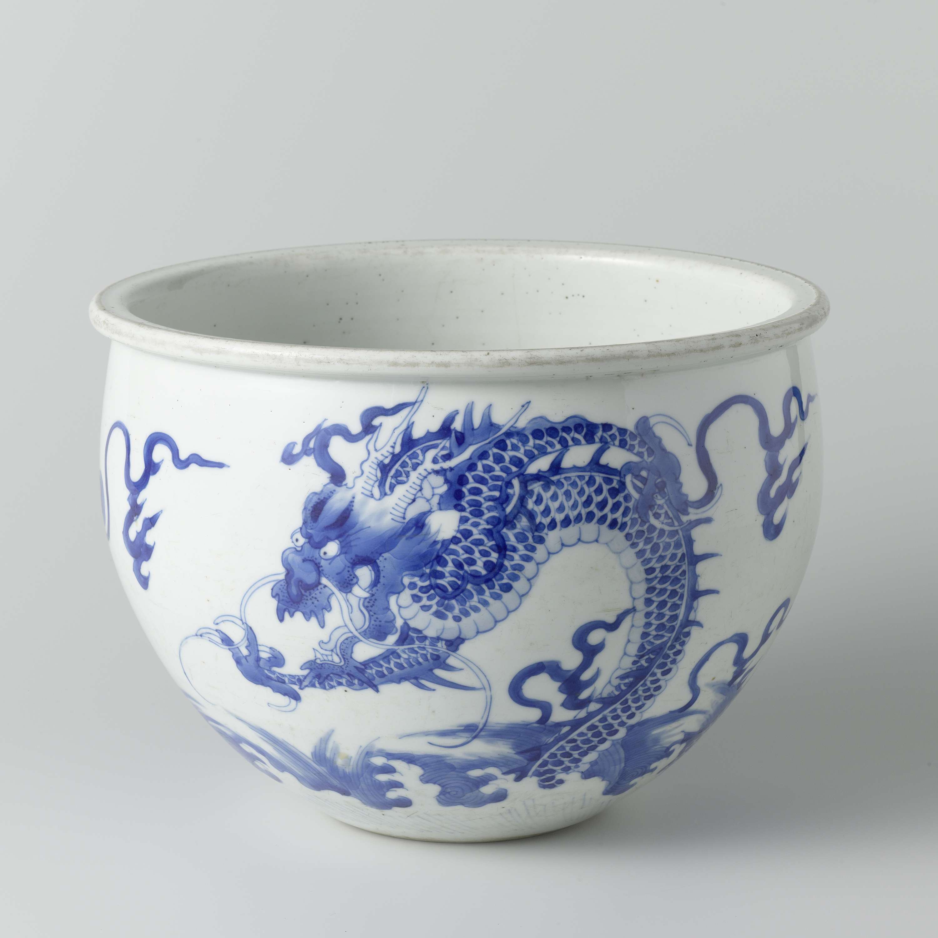 Bloempot van porselein met rond lichaam en platte rand, beschilderd in onderglazuur blauw. Op de wand tweemaal een parel najagende draak en twee karpers tussen golven; op de onderzijde een dubbele cirkel. Blauw-wit. (Nederlands)