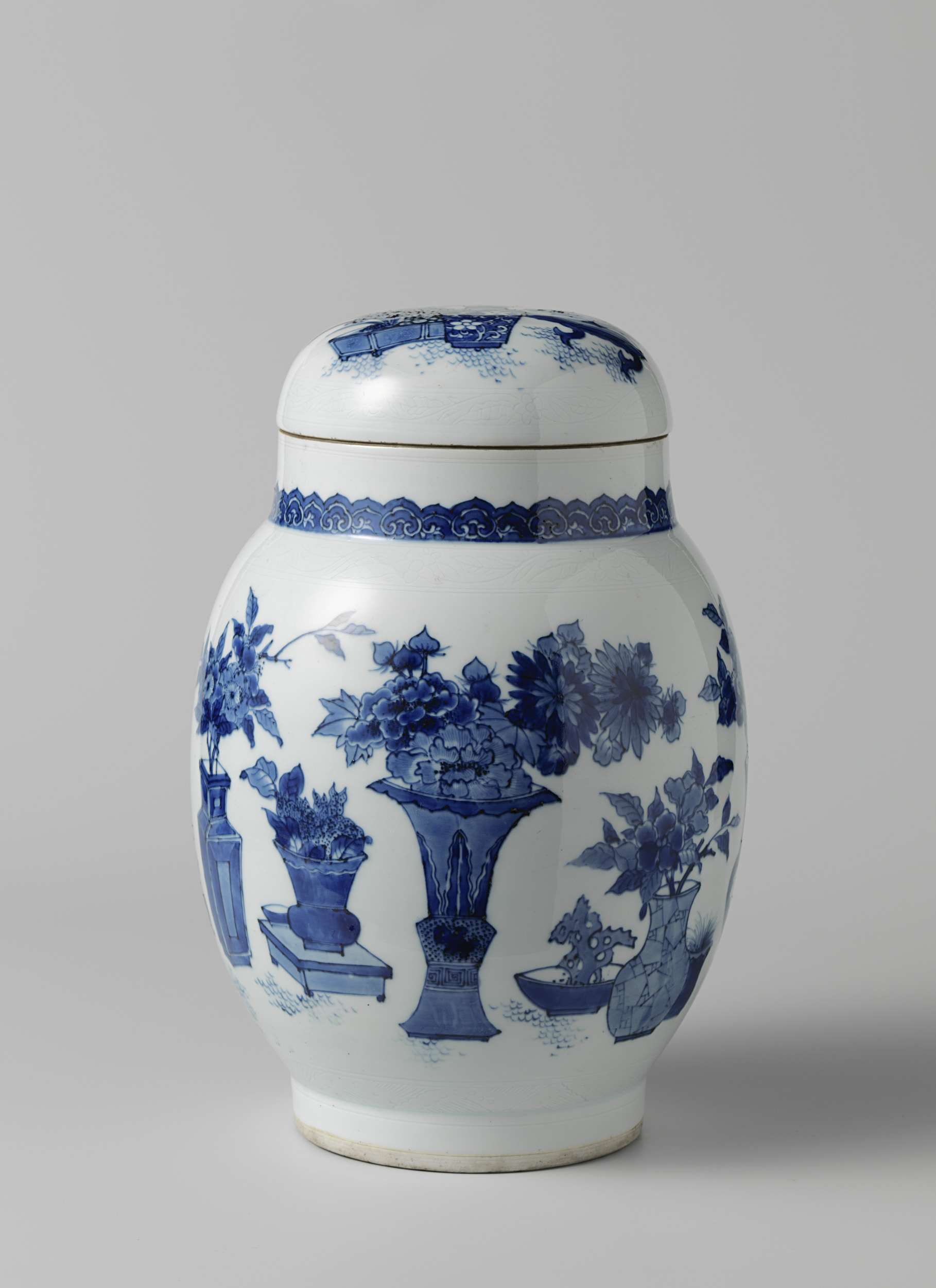 Tonvormige dekselpot van porselein, beschilderd in onderglazuur blauw. Op de wand verschillende vazen met bloemen (pioenen), gras of rotsen. Boven de voet een band met een ingegrift zigzag-patroon. Op de schouder een ingegrifte band met bloemranken; daarboven een band met ruyi-motieven. Op de deksel een bloemenvaas, een bloembak met lelies en een rots op een lage tafel. De rand met een ingegrifte band met bloemranken. Overgangsporselein in blauw-wit. (Nederlands)