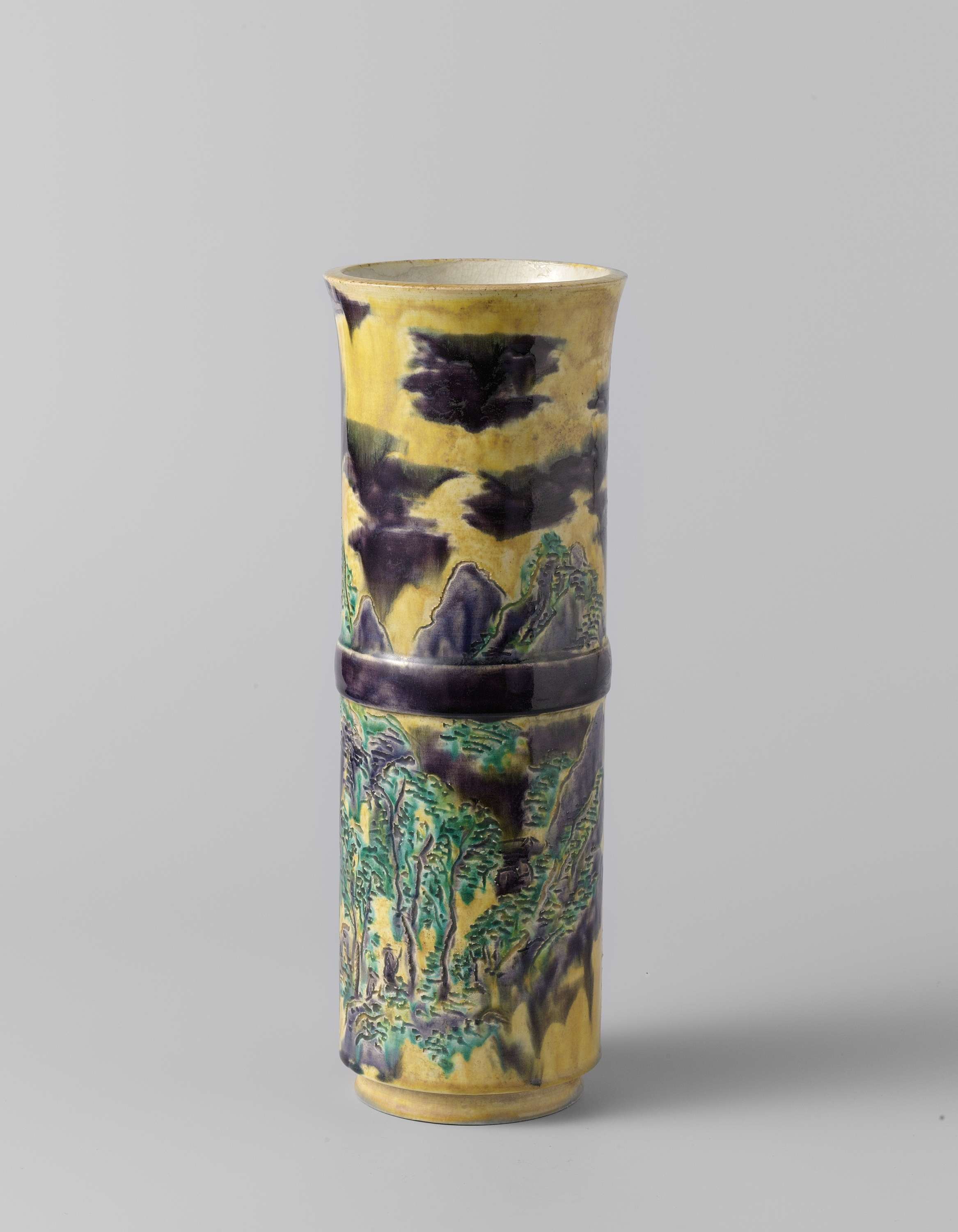 Cilindrische vaas van steengoed, iets uitlopend naar de rand en met een ringvormige verdikking. Beschilderd op het glazuur in groen, geel en paars. De vaas is door de verdikking verdeeld in twee delen met in elk een ingegrift landschap met figuren, bomen en bergen in Nanga-stijl. Gemerkt op de wand. In de voetring concentrische cirkels in reliëf. (Nederlands)