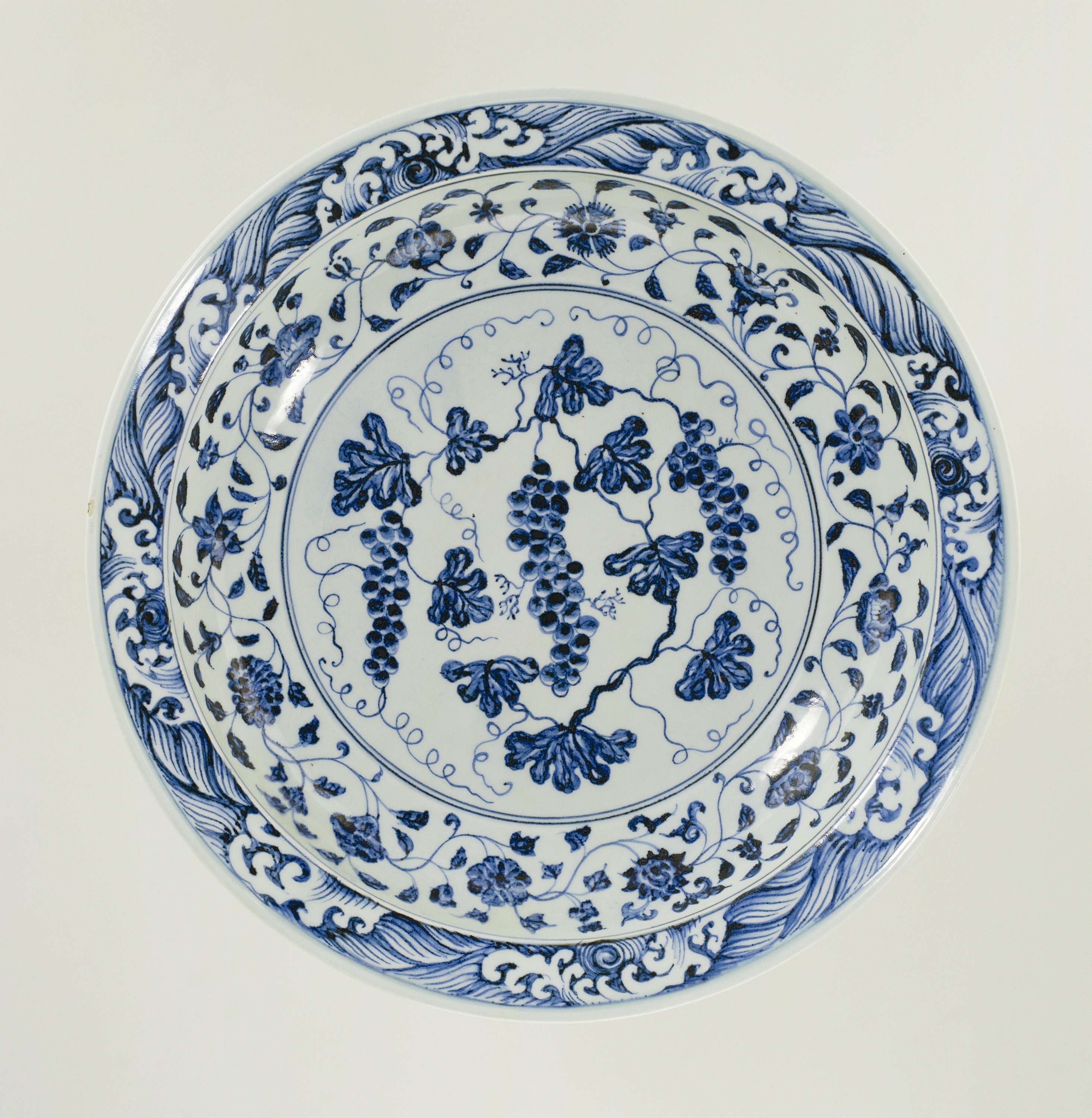 Schotel van porselein, beschilderd in onderglazuur blauw. Op het plat een druivenrank. De wand met een doorlopende bloemrank en de rand met een band met kolkende golven. De achterwand met een bloemrank. Ming porselein in blauw-wit. (Nederlands)