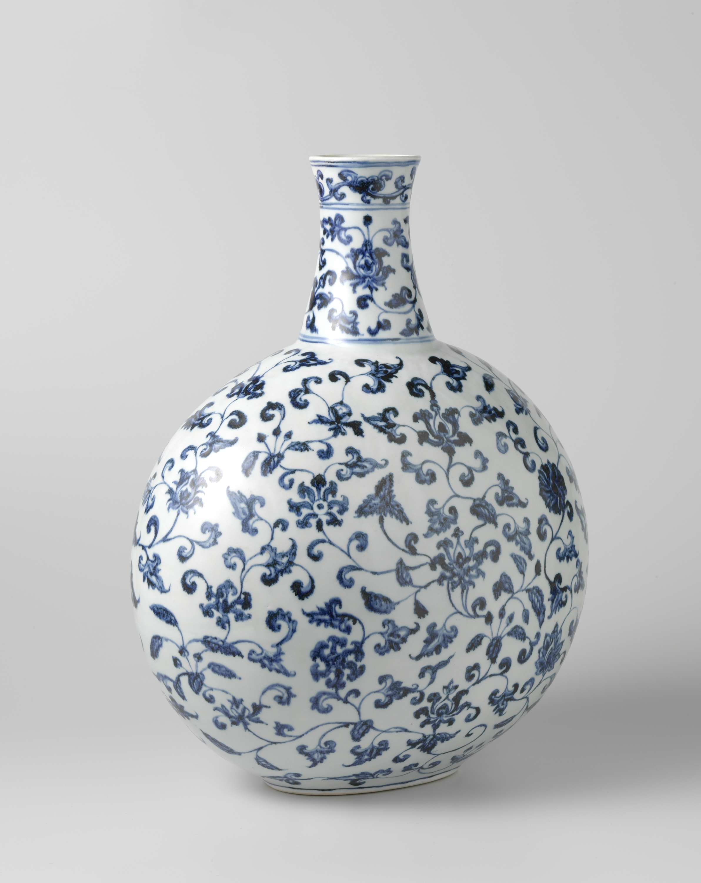 Afgeplat bolvormige fles van porselein, de nek loopt naar onder en boven toe iets uit, beschilderd in onderglazuur blauw. De hele fles is versierd met een doorlopend patroon van bloem- en bladranken (lotus). De rand is gerestaureerd. Ming porselein in blauw-wit. (Nederlands)