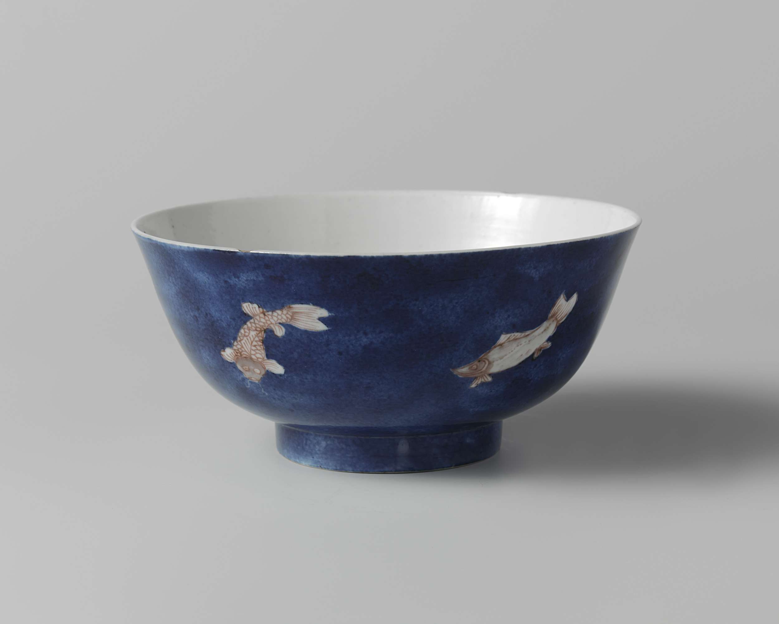 Kom met spreidende wand van porselein, beschilderd in onderglazuur blauw en rood. De wand is bedekt met bleu poudré (poederblauw) waarin zes vissen in onderglazuur rood zijn uitgespaard. Op de onderzijde het zes-karaktermerk van keizer Chenghua in een dubbele cirkel. Twee chips in de rand. Onderglazuur blauw met koperrood. (Nederlands)