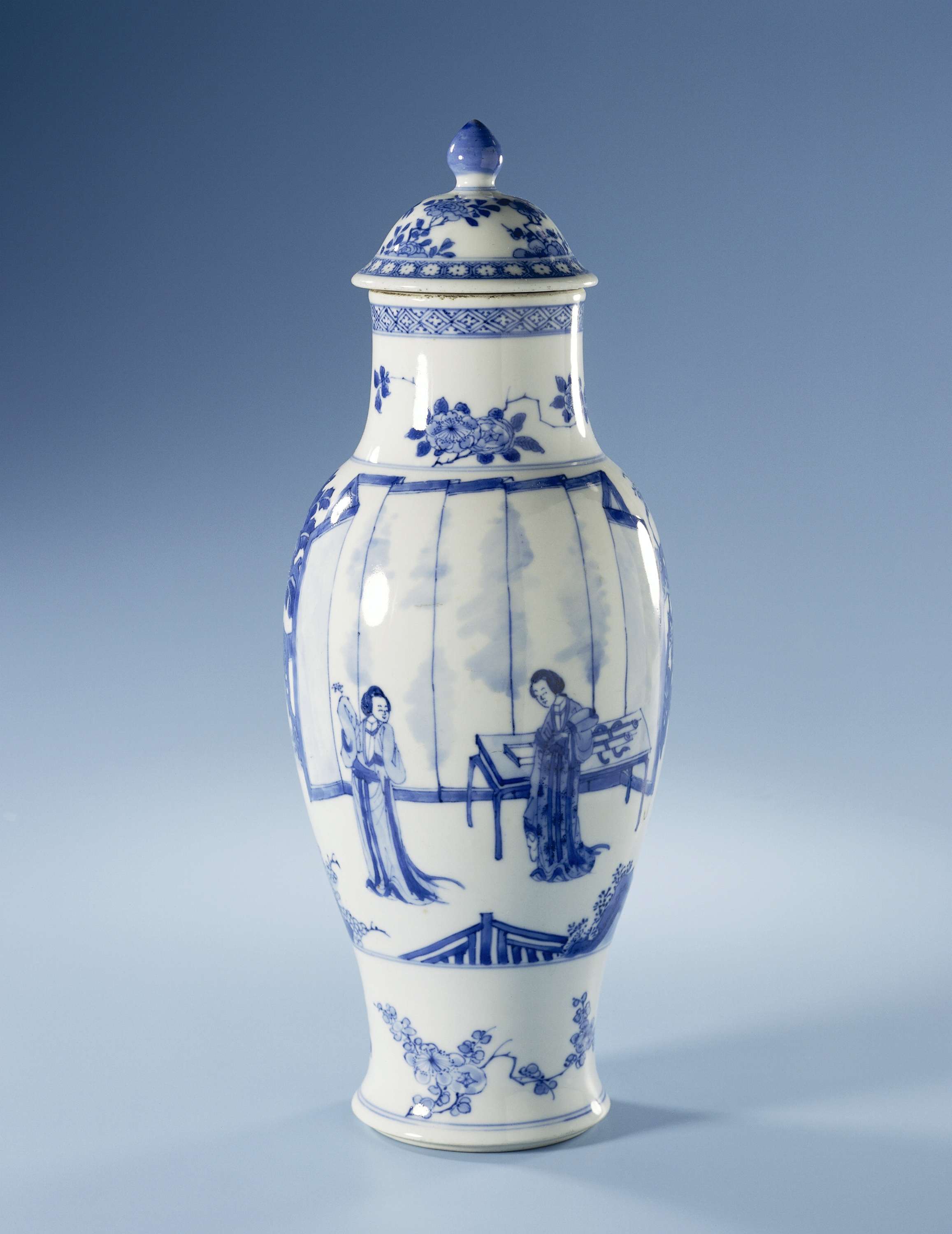 Balustervormige, slanke dekselpot van porselein met brede nek, beschilderd in onderglazuur blauw. Op de wand aan de ene zijde twee vrouwen (lange lijzen) in een omheinde tuin met elk een twijgje in de hand; aan de andere zijde twee vrouwen bij een tafel voor een groot scherm, de een met een waaier en de ander met een twijgje in de hand; om de voet twee bloemtakken; om de nek twee bloemtakken; de rand met een band servetwerk; de deksel met knop en vier bloemtakken met een band met geometrisch motief. Een chip in de rand van de deksel. Blauw-wit. (Nederlands)