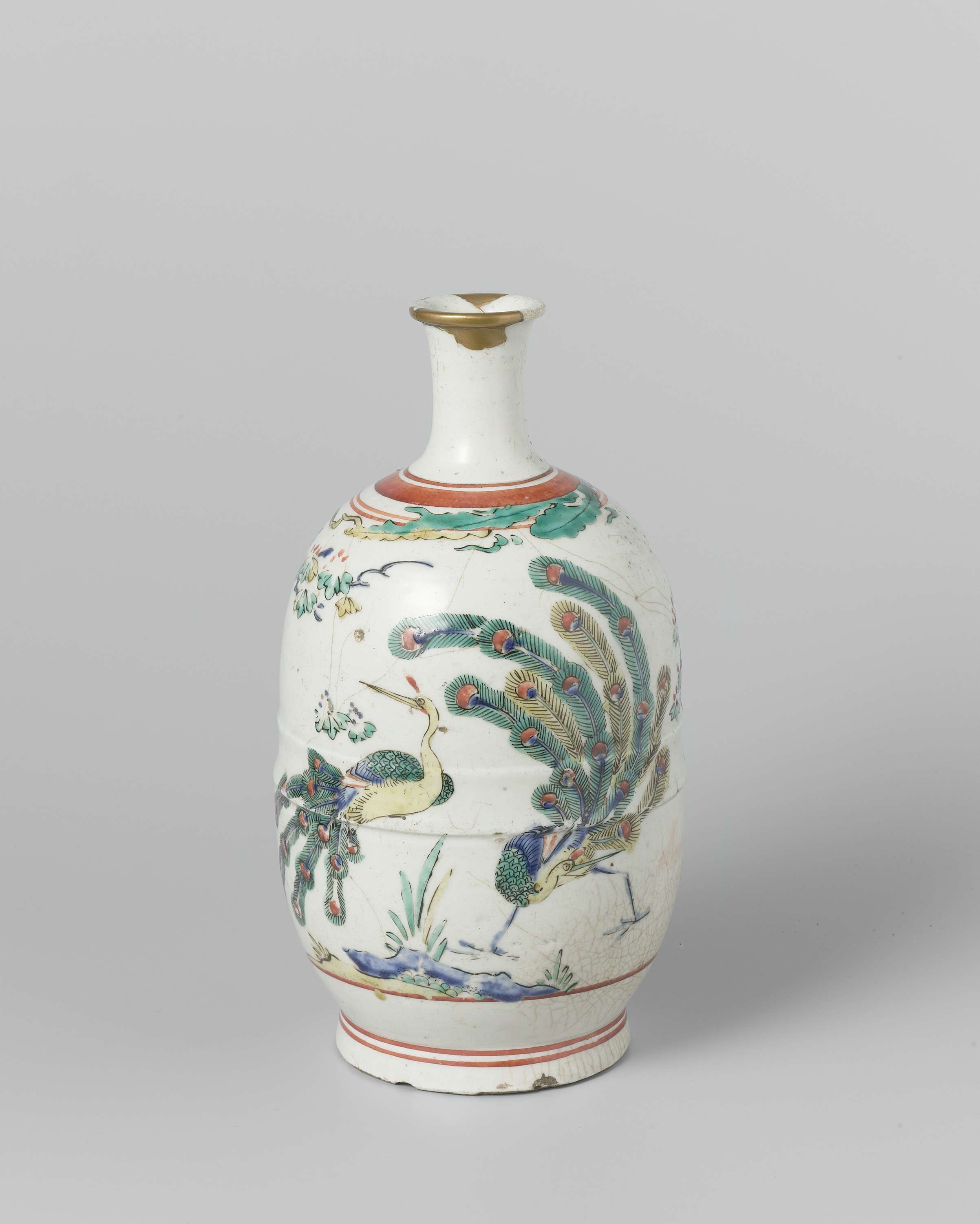 Fles (sakefles) van porselein met een smalle, iets spreidende nek, beschilderd op het glazuur in blauw, rood, groen, geel en zwart. Op de buik tweemaal een pauw bij een rots met een bloeiende plant. Op de schouder bladeren en rode lijnen. Goudlakreparatie in de rand. Arita (Kakiemon-stijl). (Nederlands)