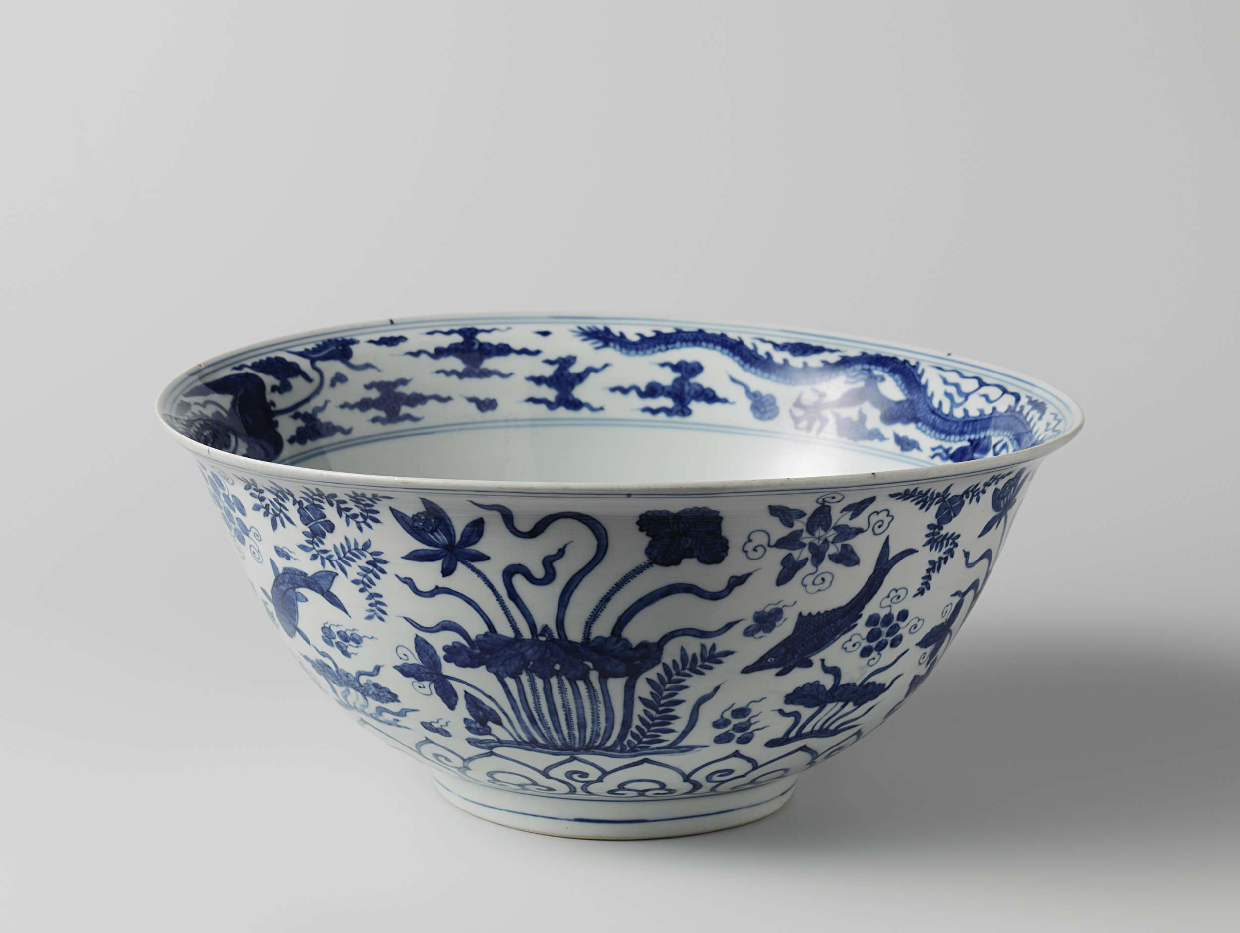 Grote, klokvormige kom van porselein, beschilderd in onderglazuur blauw. Op de buitenwand vissen tussen water- en lotusplanten. Boven de voet een band met ruyi-motieven. Op de bodem een vijf-klauwige draak tussen wolken en vlammen. De binnenrand met een band met een fenghuang en een vijf-klauwige, parel najagende draak tussen vlammen en wolken. Gemerkt op de onderzijde met het zes-karaktermerk van keizer Wanli in een dubbele cirkel. Ming porselein in blauw-wit. (Nederlands)