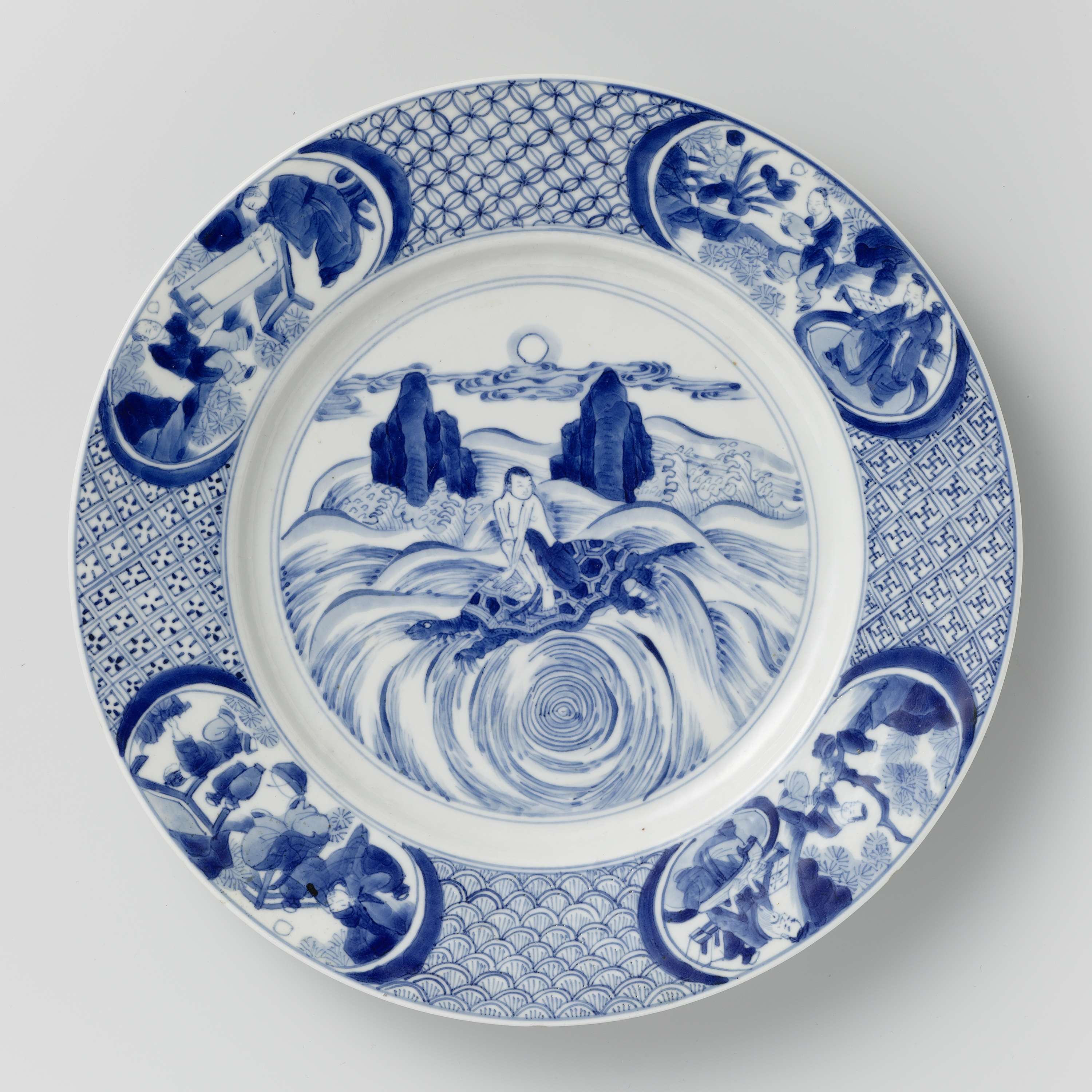 Bord op voetring, met platte rand, gedecoreerd in onderglazuur blauw met een naakte jongen op een grote schildpad in kolkend water; op de achtergrond twee rotsen in de golven. De rand heeft vier verschillende soorten decoratiepatronen, die van elkaar gescheiden worden door vier panelen. De panelen hebben verschillende beschilderingen; bedienden die een kachel opstoken; een man die een 'qin' bespeelt vrouwen die 'go' spelen; een geleerde die een rol bekijkt. Aan de achterzijde van de wand vier kostbare objecten. Op de bodem het zes-karaktermerk Kangxi in een dubbele cirkel. (Nederlands)