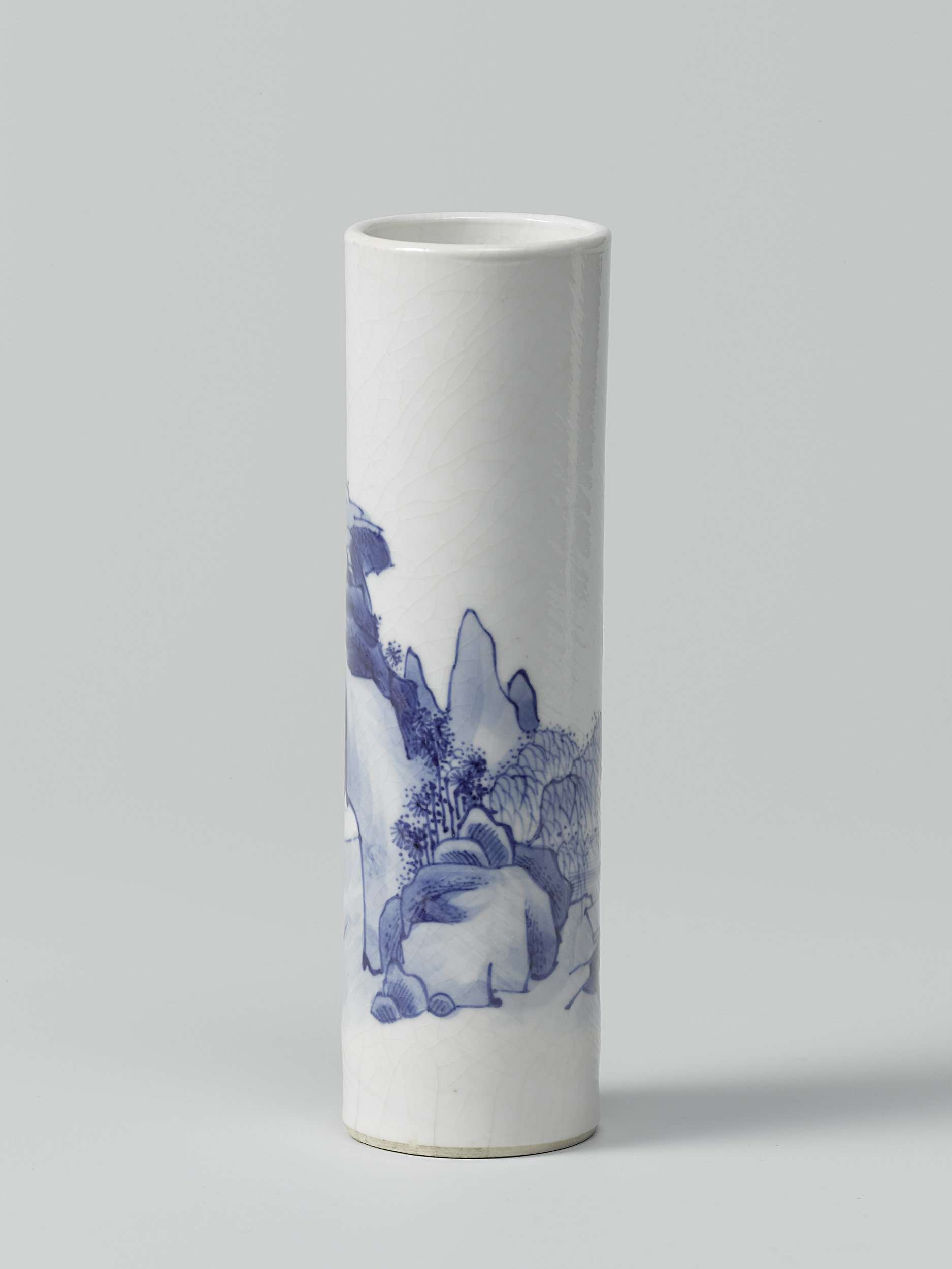 Slanke, cilindrische penselenpot van soft-paste porselein, beschilderd in onderglazuur blauw met een herdersjongen die een os bereidt. De vertaling van de inscriptie luidt: 'de herdersjongen komt naar huis, schrijlings gezeten op de buffel. Hij improviseert op de fluit zonder voorgeschreven melodie'. (Nederlands)