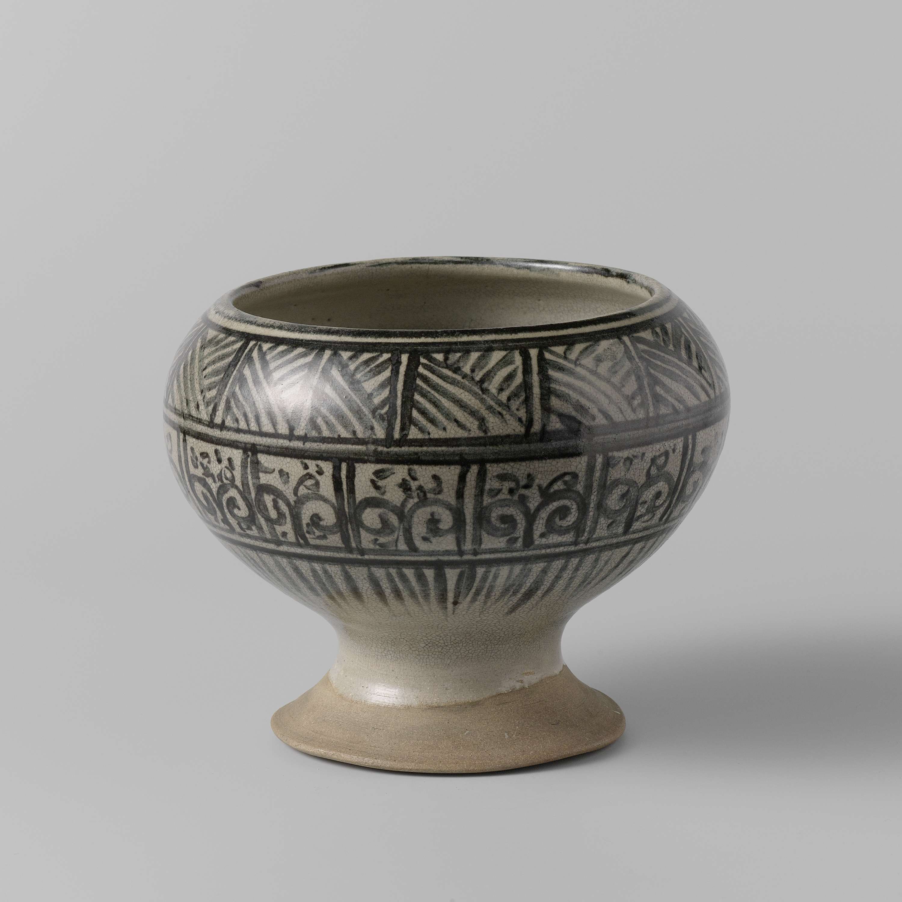 Bokaalvormige vaas van steengoed, bedekt met een gecraqueleerd, grijs glazuur en beschilderd in onderglazuur blauw. Op de kom drie decoratieve banden: één met horizontale strepen, één met bloemranken in vierkante vakken en een met arceerwerk in vierkante vakken. De voet en de onderzijde zijn ongeglazuurd. Kyoyaki. (Nederlands)