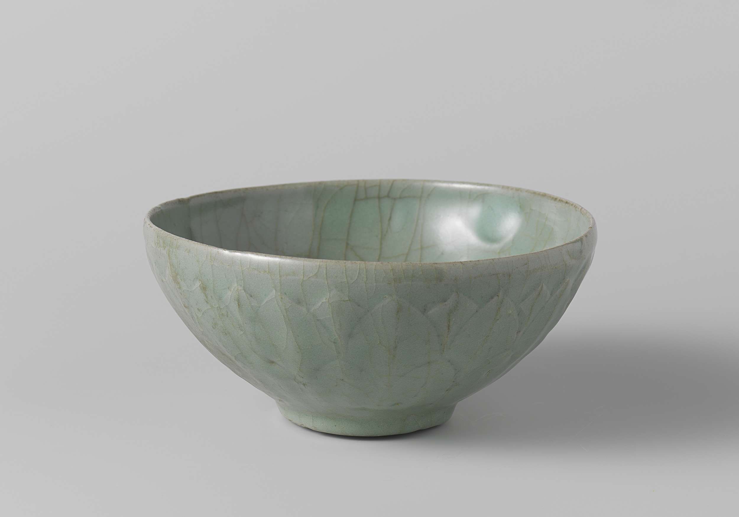 Kom van steengoed, bedekt met een gecraqueleerd groen glazuur. De buitenwand met een band gemodelleerde lotusbladeren. Celadon. (Nederlands)