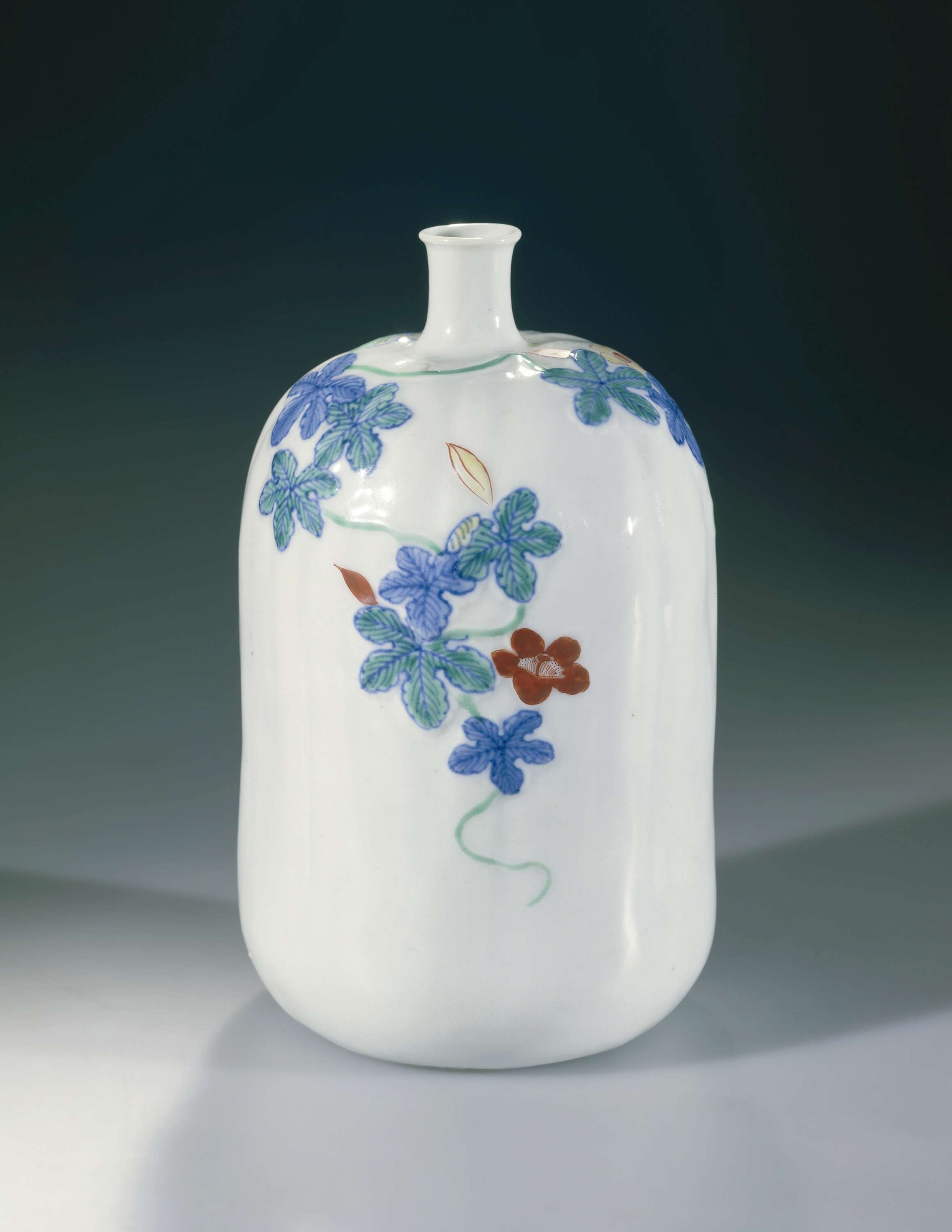 Nabeshima (?). Sake-fles in de vorm van een kalebas. Versierd met bloeiende ranken in onderglazuurblauw en in reliëf met email boven het glazuur. (Nederlands)