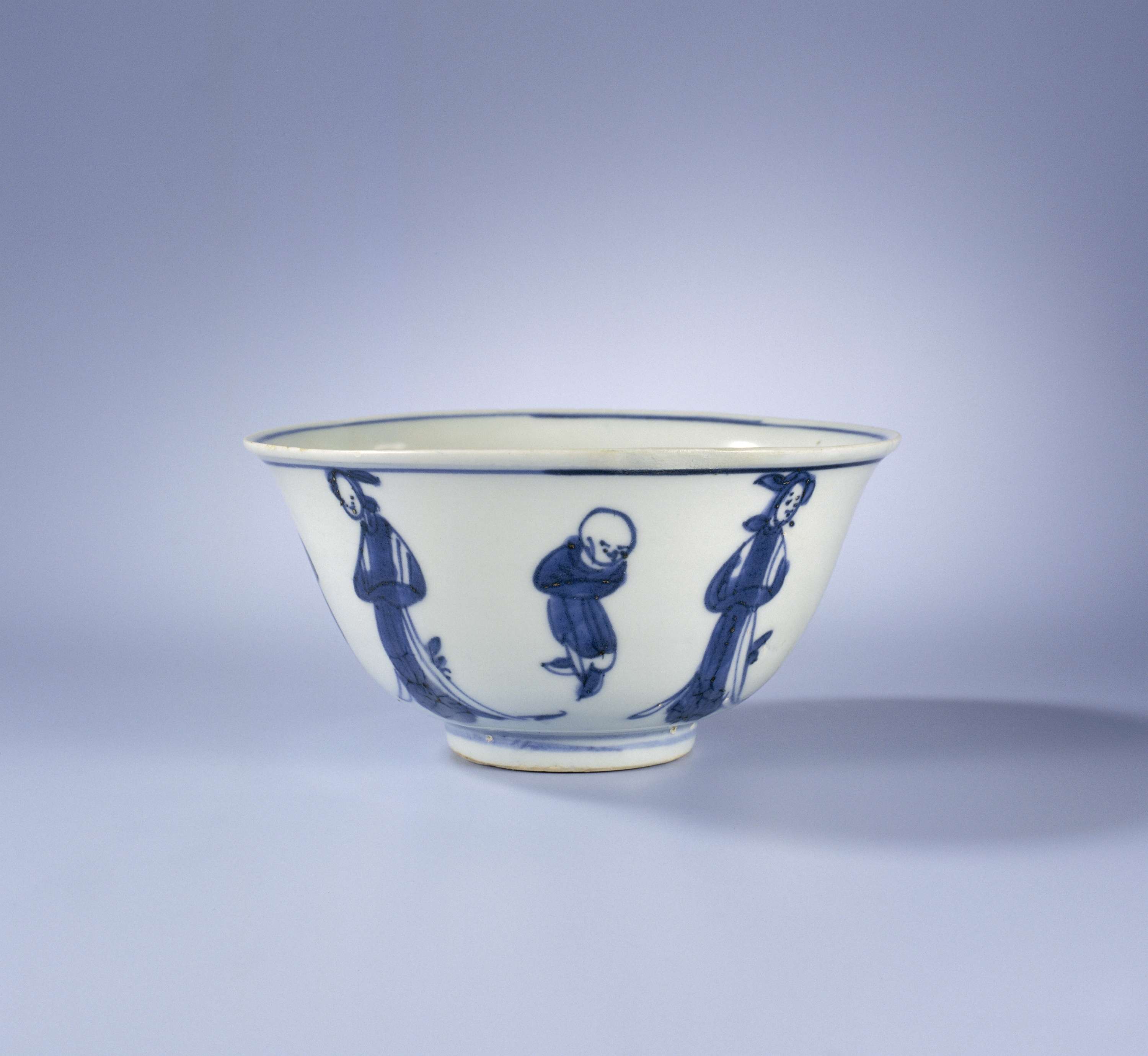 Kom op voetring en uitspreidende rand. Gedecoreerd in onderglazuur blauw, met aan de buitenzijde de voorstelling van vier vrouwenfiguren en kinderen. In het midden van de binnenzijde van de kom een staande geleerde in een cirkel. Gemerkt op de bodem met een vier-karaktermerk, wat zich laat lezen als 'chang chun jia qi' -hetgeen betekent 'fraaie kom en eeuwigdurende lente'. (Nederlands)