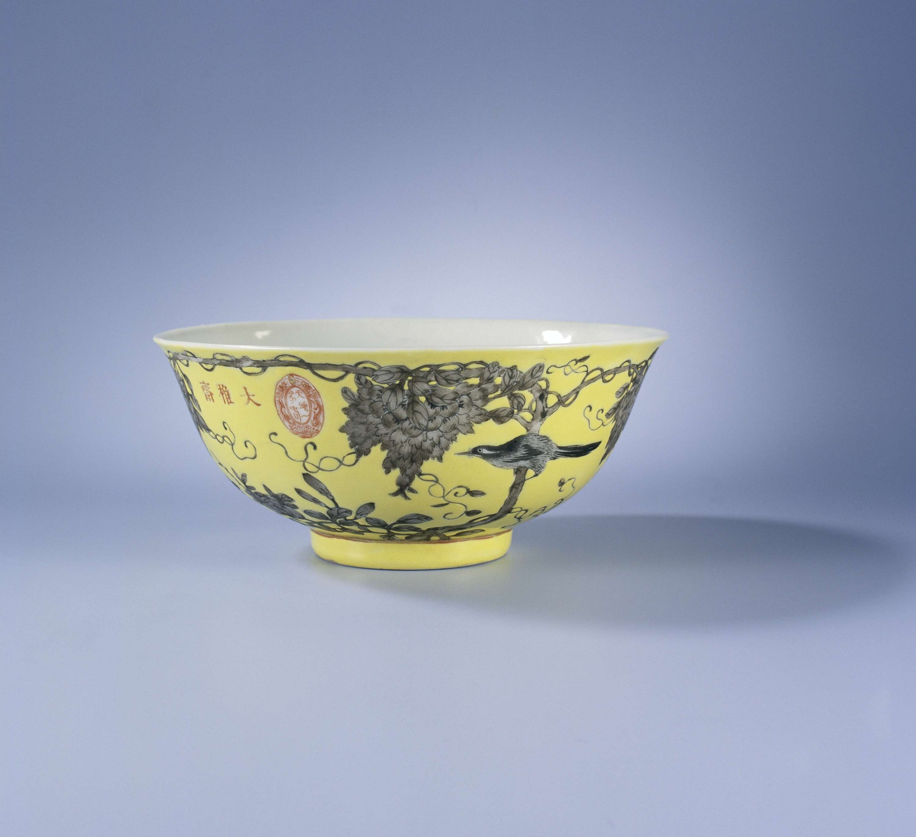 Klokvormige kom van porselein, bedekt met een geel glazuur en beschilderd in rood en zwart. De buitenzijde van de kom is bedekt met een geel glazuur met hierin uitgespaard in grijstinten een vogel op een tak met bloeiende blauwe regen; op de rand het zegelmerk van keizerin-regentes Cixi met het opschrift 'Tiandi yijia chun', 'Hemel en aarde vieren de lente als een familie', naast het zegel drie karakters lezend 'Daya zhai', 'het atelier van hoge cultuur'. Gemerkt op de onderzijde met een vier-karaktermerk 'yongqing changchun', 'eeuwige geluk en voortdurende lente'. Porselein met emailkleuren. (Nederlands)