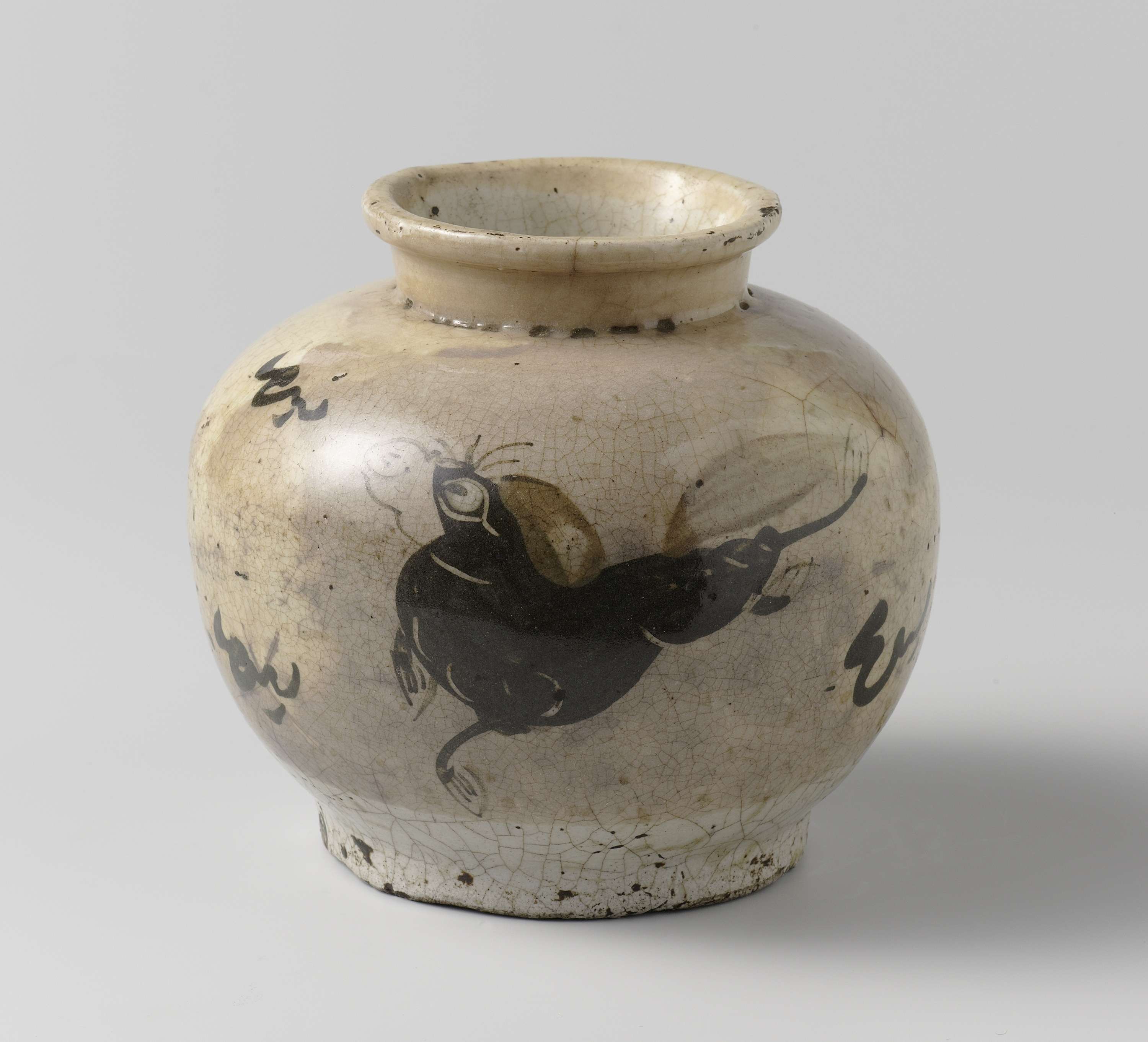 Pot van steengoed met een gedrukt bolvormig lichaam, bedekt met een wit slib en onder het glazuur beschilderd in bruin. Op de buik een galopperend paard. De onderzijde is ongeglazuurd. Cizhou. (Nederlands)