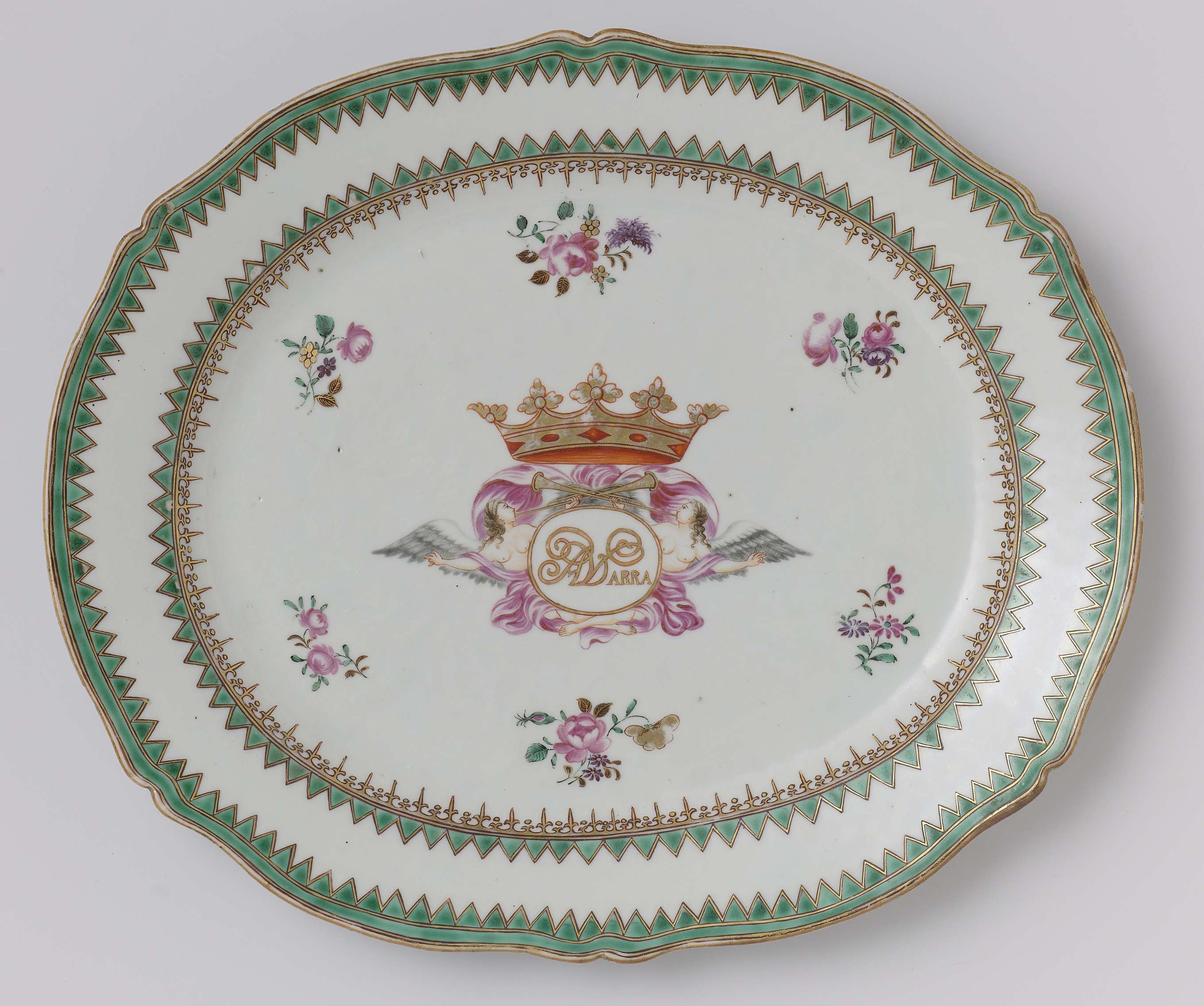 Ovale schotel van porselein met geschulpte rand, beschilderd op het glazuur in rood, roze, groen, paars, zwart en goud. In het centrum het wapen van Petrus Albertus van de Parra (1714-1775). In het schild staat de naam ‘PA VD PARRA’ in goud en ijzerrood. Boven het wapen is een kroon afgebeeld en het dekkleed bestaat uit een draperie in paars en aan weerszijden van het wapen een engel die de bazuin blaast. Hieromheen zijn bloemtakken afgebeeld. Op de wand een band van spearheads in goud. De rand wordt begrensd met een dubbel zaagtand-motief. Wapenporselein. (Nederlands)