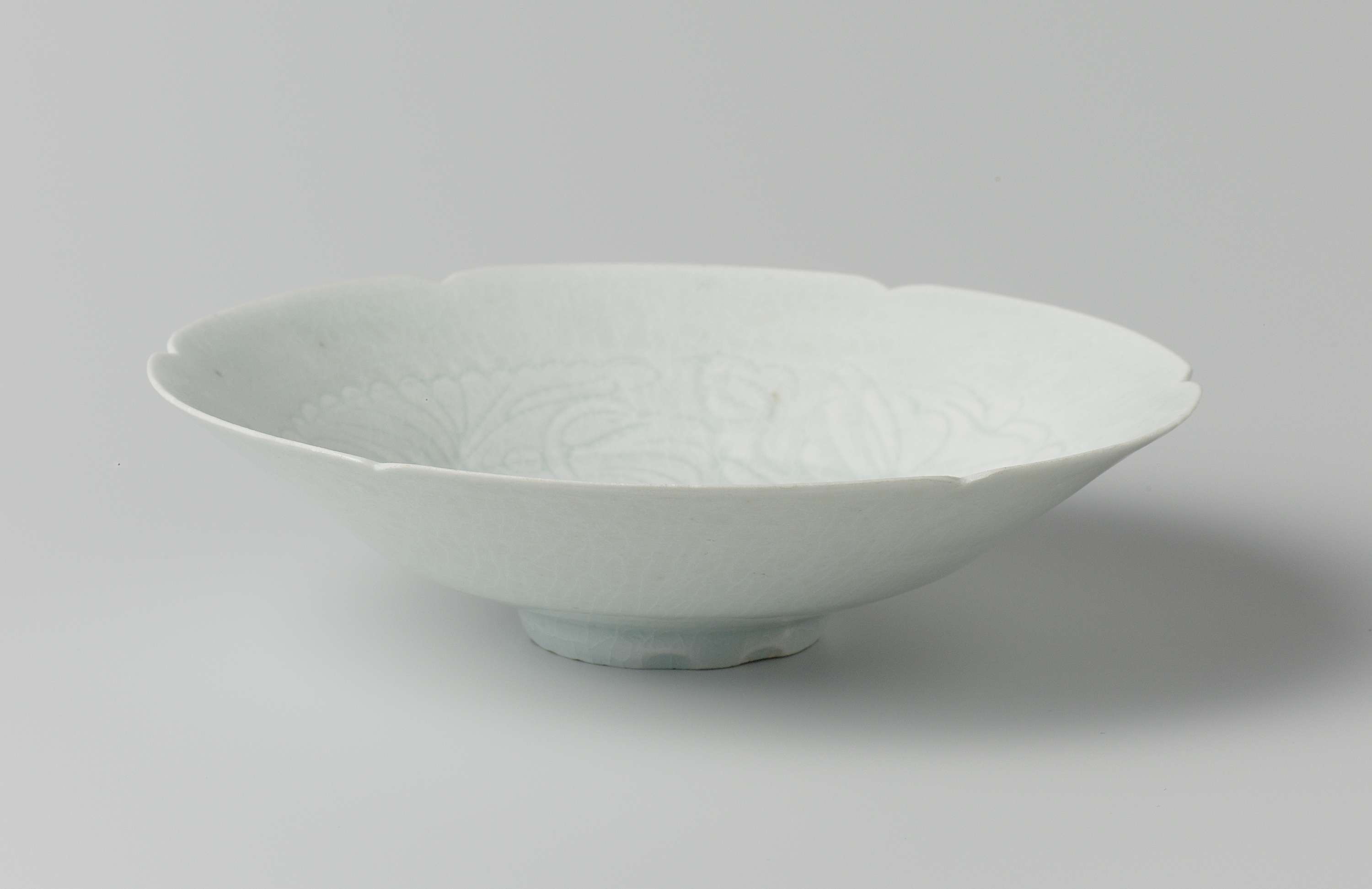 Gelobde schaal met een bloemdecoratie in reliëf onder het glazuur. Qingbai-goed. (Nederlands)