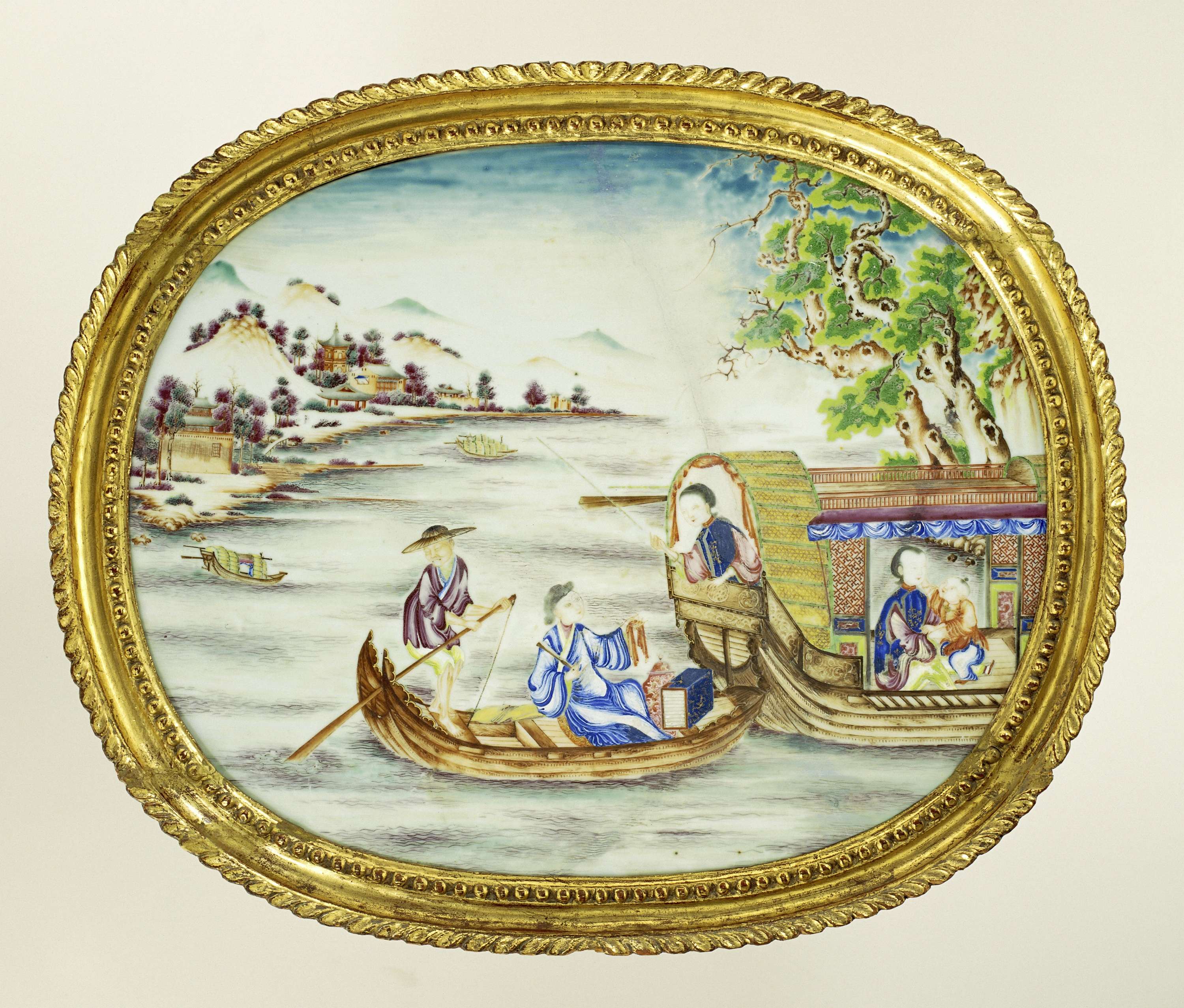 Ovale plaque van porselein, beschilderd op het glazuur in blauw, rood, roze, groen, geel, paars, bruin, zwart en goud. De voorstelling toont een rivierlandschap met bergen, bomen, paviljoens en boten. Op de voorgrond een kleine boot met een roeier en een man met objecten. Ze varen naast een grotere boot, waar een vrouw aan de achterzijde uit leunt. De man toont haar een voorwerp. In de grotere boot een tweede vrouw en een jongen. Originele vergulde lijst. Porselein met emailkleuren. (Nederlands)