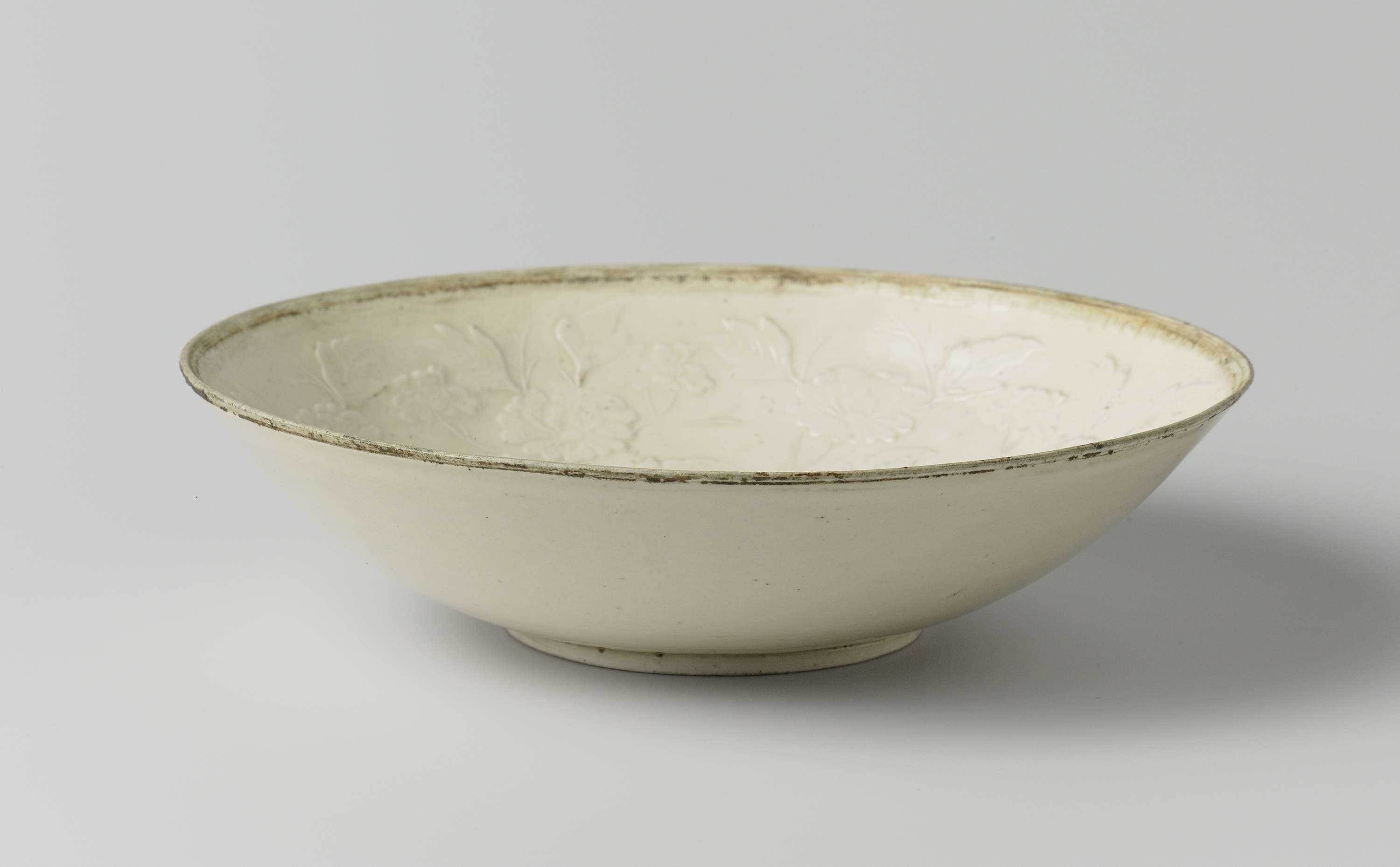 Kom van steengoed, Ding yao-type. Ivoor-kleurige glazuur en ingeperste bloeiende prunustakken. (Nederlands)