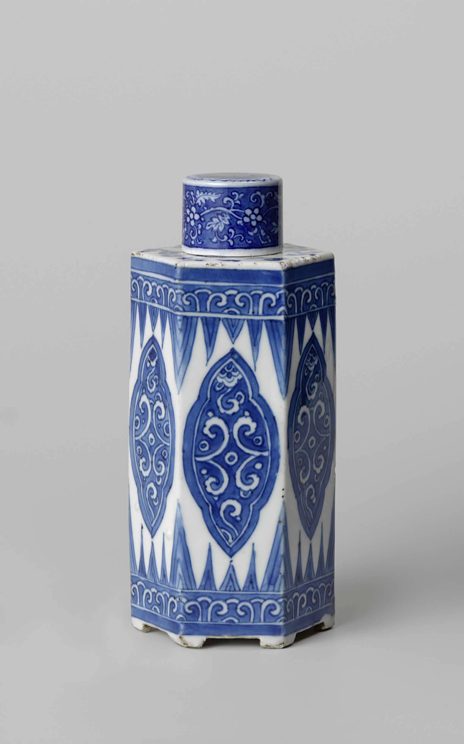 Zeshoekige theebus van porselein op zes korte voeten, beschilderd in onderglazuur blauw. Op elke zijde een gelobd cartouche met bloemranken uitgespaard in een blauwe achtergrond. Aan de boven- en onderzijde drie decoratieve banden: één blauw, één met ranken uitgespaard in blauw en een met staande of afhangende, puntige bladmotieven. De deksel met bloemranken uitgespaard in blauw. Blauw-wit. (Nederlands)