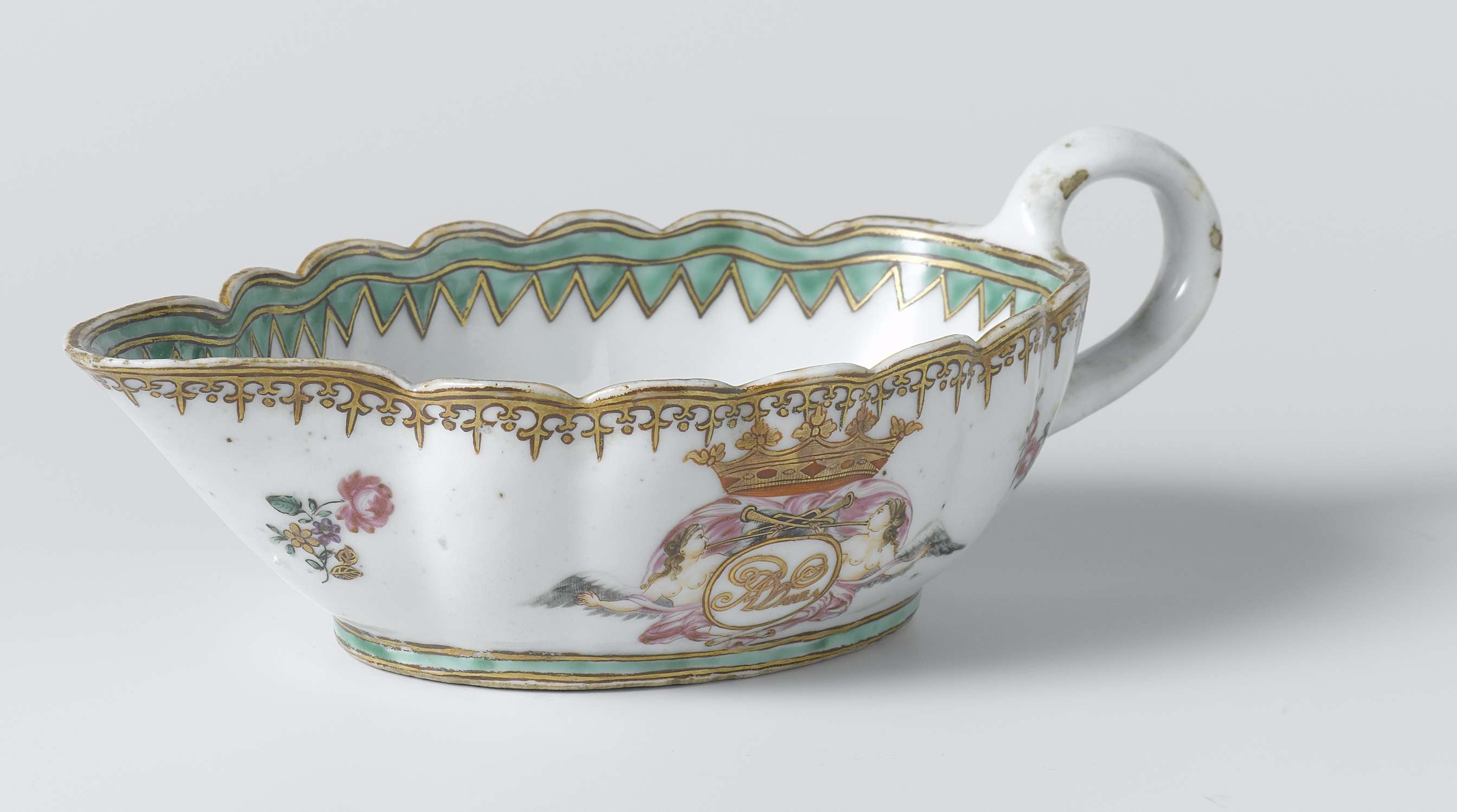 Sauskom van porselein met geribde wand en gelobde rand, beschilderd op het glazuur in rood, roze, groen, paars, zwart en goud. Op de buitenwand tweemaal een gekroond wapen met 'P.A. vd Parra' geflankeerd door twee putti blazend op trompetten, aan weerszijden van het wapen een bloemtak; de buitenrand met een 'spearhead-border'; de binnenrand met een zaagtand-motief. Wapen van Petrus Albertus van de Parra (1714-1775). Wapenporselein. (Nederlands)