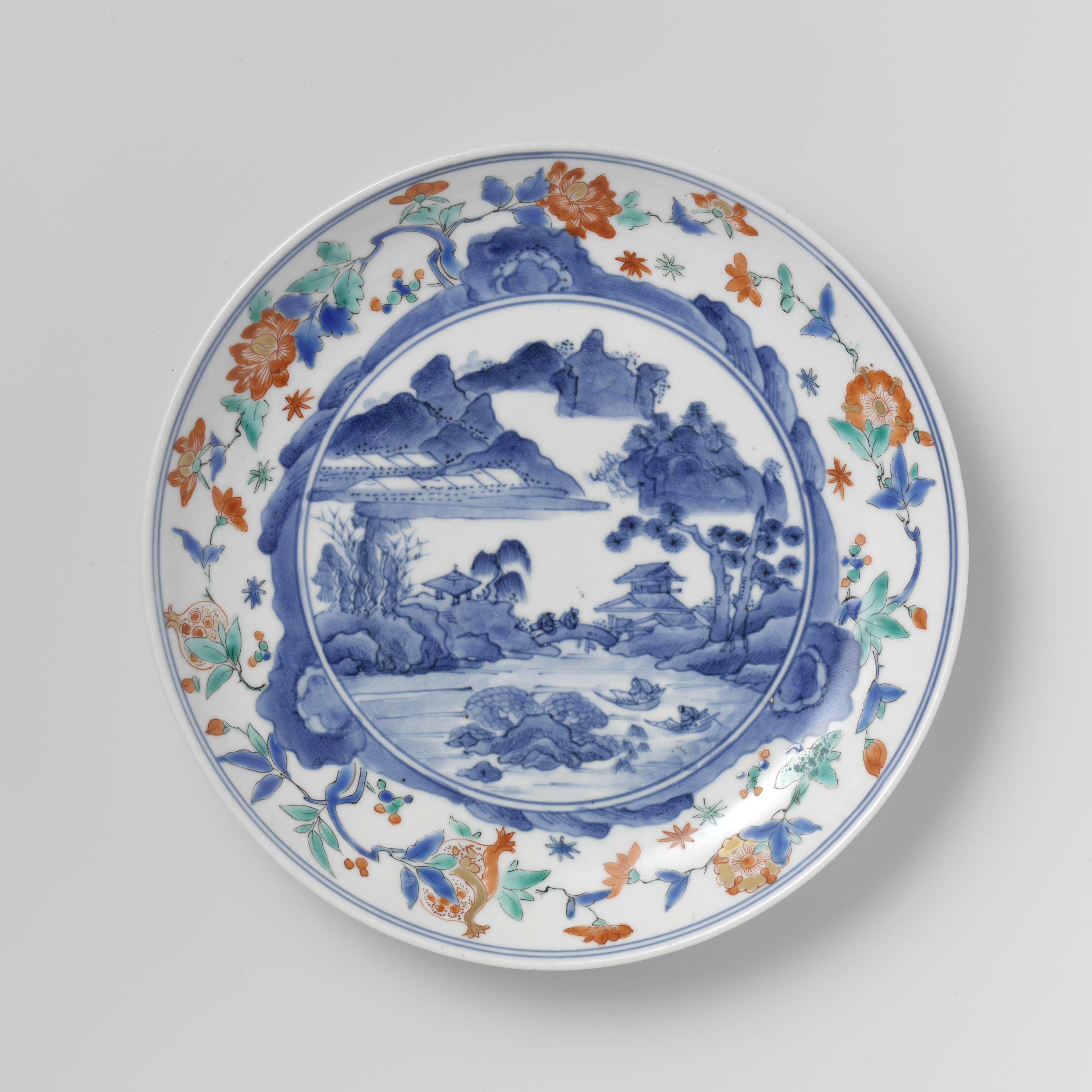 Bord van porselein, beschilderd in onderglazuur blauw en op het glazuur blauw, rood, groen, geel, zwart en goud. Op het plat een rivierlandschap met twee personen op een brug, twee boten, bergen, paviljoens en bomen (pijnboom, wilg). Op de rand een doorlopende rotspartij met driemaal een bloeiende plant (pioen, granaatappel). De buitenrand met een doorlopende bloemrank. Twee proenen op de onderzijde. Kakiemon. (Nederlands)