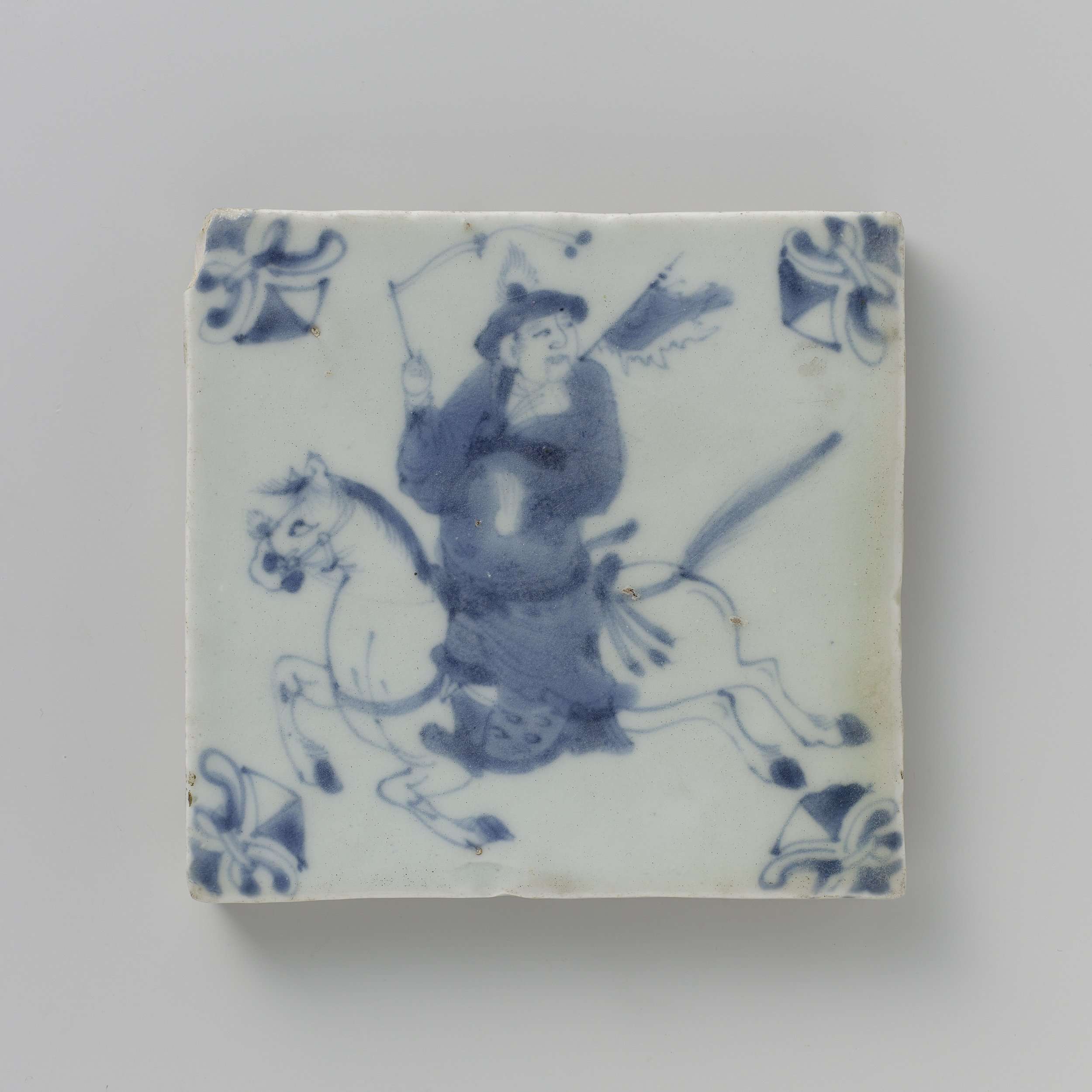 Tegel van porselein, beschilderd in onderglazuur blauw. Op de tegel een krijger te paard. In elke hoek een Europees fleur-de-lis motief. Overgangsporselein in blauw-wit. (Nederlands)