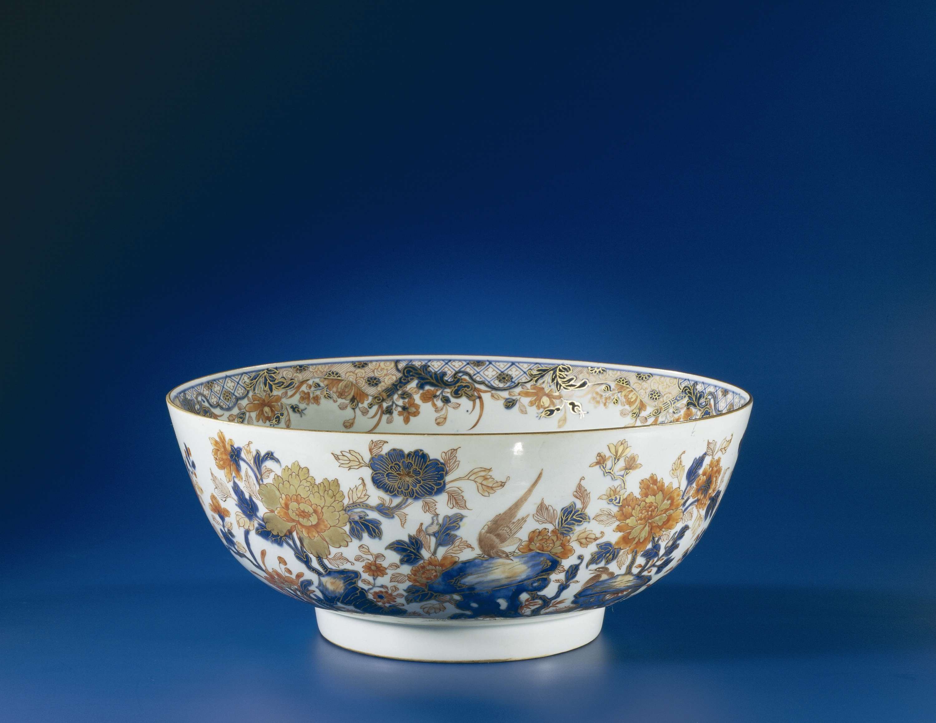 Punchkom van porselein, beschilderd in onderglazuur blauw en op het glazuur rood en goud. Op de buitenwand een rots met twee fazanten en een grote bloemgroep met pioen en magnolia, daarnaast een kleinere pioenplant, orchidee en losse bloemtak waarboven een vlinder; op de bodem vier karpers; de binnenrand met cartouches met servetwerk afgewisseld met geopende schilderij rollen met wolkmotief en bloemen; hieronder afhangende bloemen. Chinees Imari. (Nederlands)