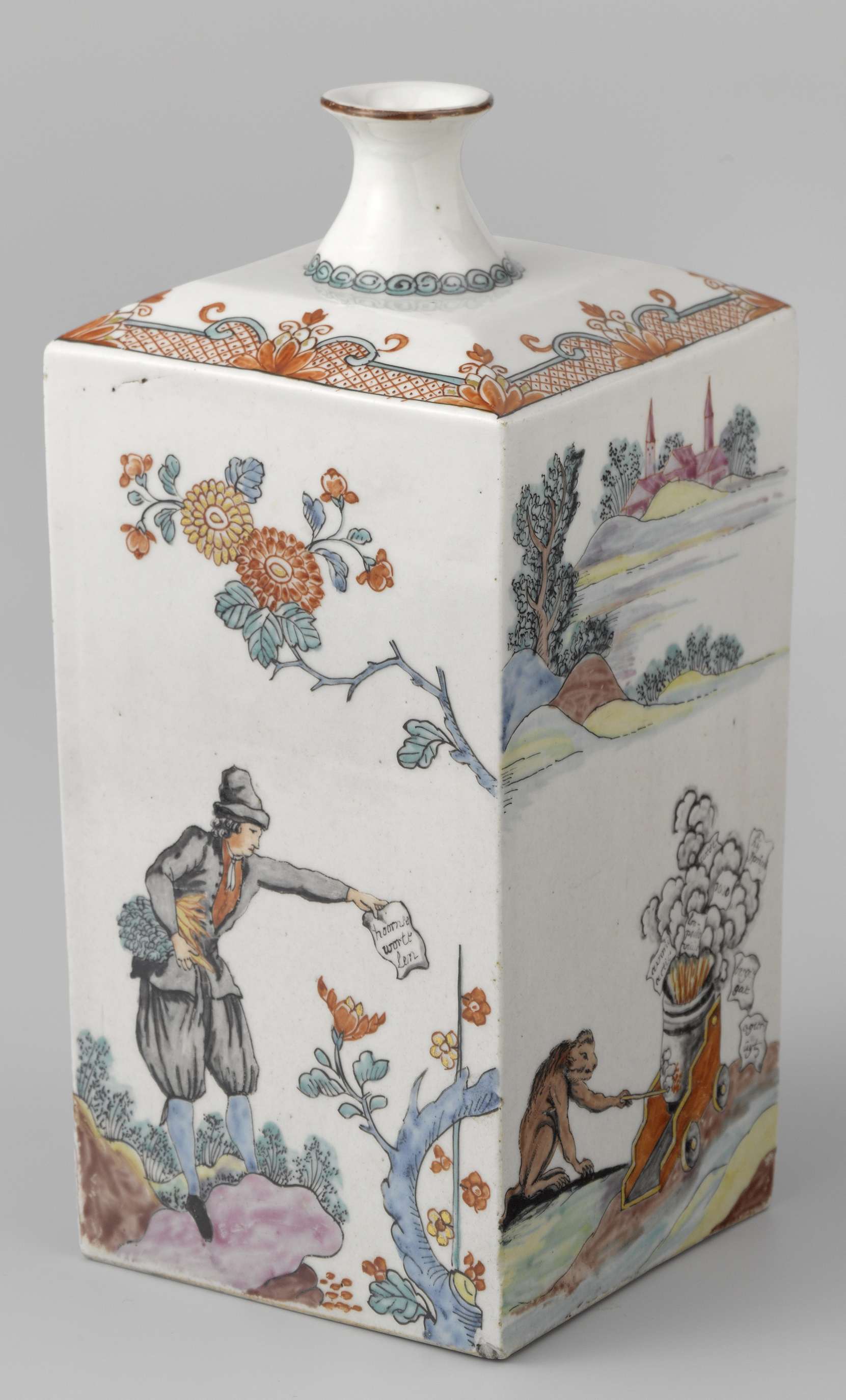 Vierkante fles van porselein met een smalle, spreidende hals, beschilderd op het glazuur in blauw, rood, groen, geel, paars, bruin, zwart en goud. Op de wand tweemaal twee voorstellingen: een Europese man in een landschap bij een bloeiende plant, onder zijn ene arm een bos wortelen en in de andere hand een briefje met 'hoornse wortelen'; een rivierlandschap met op de voorgrond een aap, die een bombarde op een rood affuit afschiet waardoor hier verschillende briefjes uitschieten met de opschriften 'avond actie', 'lopend vuur', 'west', '1000', 'hij springt', 'bergit gat' en 'agter teijt'. Op de schouder een band met servetwerk en lotusbloemen. Rond de hals een band met een spiraalpatroon. Een barst in de wand. Arita, Europese voorstelling in Europa gedecoreerd[?] in de Japanse Kakiemon-stijl. (Nederlands)