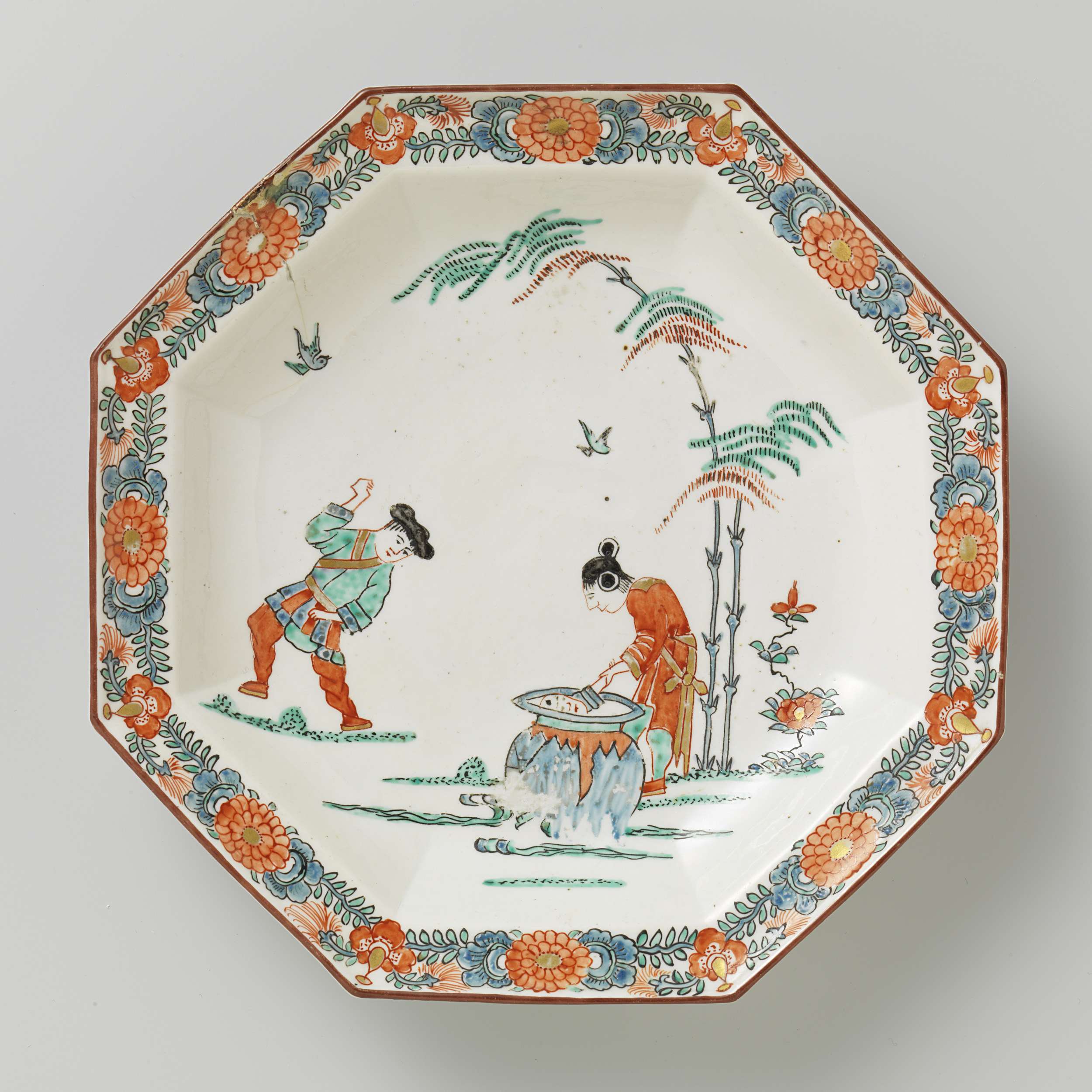 Achthoekig bord van porselein, beschilderd op het glazuur in blauw, rood, groen, zwart en goud. Op het plat een voorstelling van Shiba Onko (Sima Guang) naast de waterpot waar een kind in is gevallen. Een derde persoon staat aan de andere zijde van de pot. Op de rand een band met bloemranken. Drie proenen op de onderzijde. Een barst in de rand. Arita, in Europa gedecoreerd in de Japanse Kakiemon-stijl. (Nederlands)