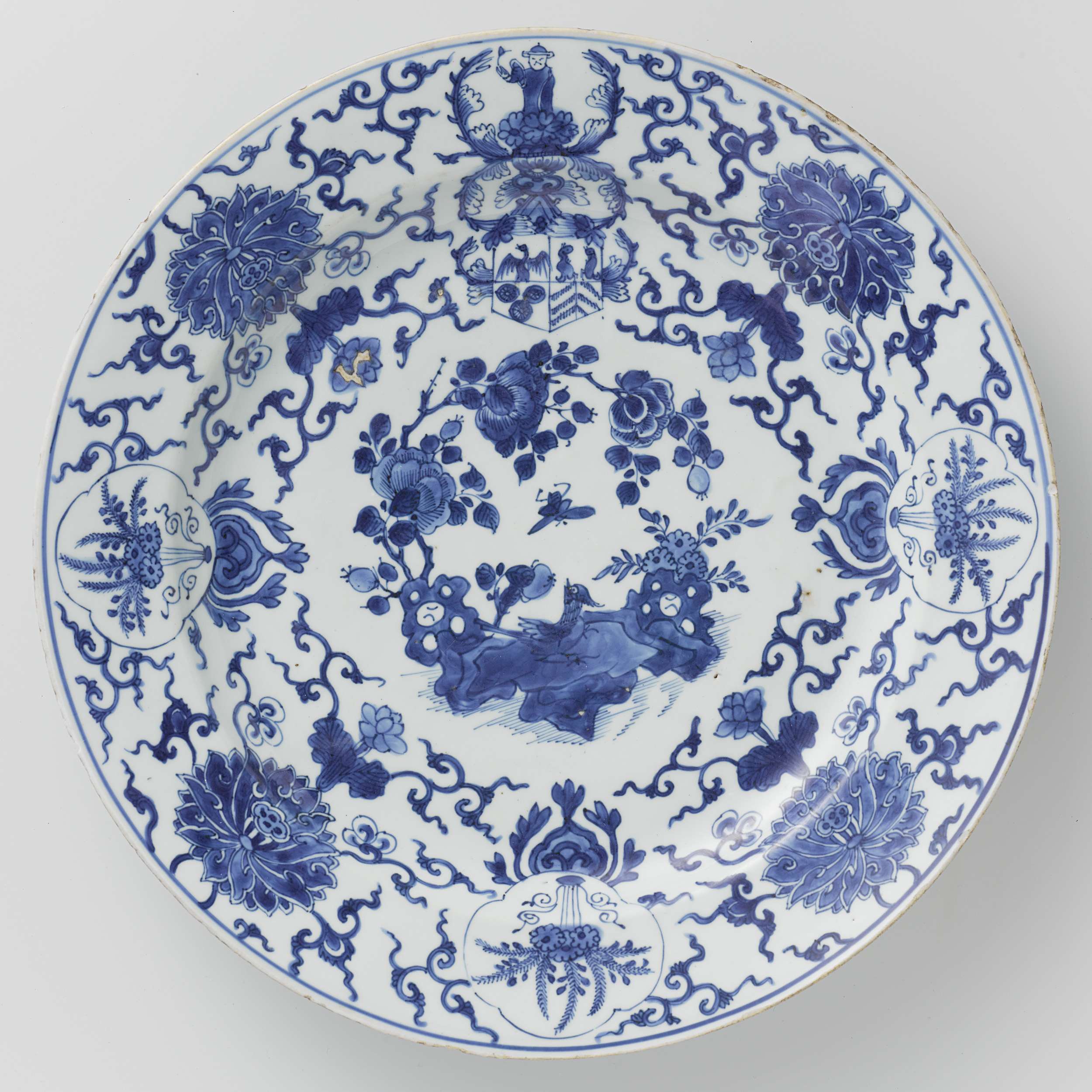 Schotel van porselein, beschilderd in onderglazuur blauw. Op het plat een vogel op een rots bij bloeiende planten (pioen). Op de wand en rand afwisselend grote lotusranken en een gelobd cartouche met een gestileerde bloeiende plant. Hiertussen het wapen van de familie Pelgrom omgeven door acanthusbladeren en als helmteken een Aziatisch figuur. Wapenporselein in blauw-wit. (Nederlands)