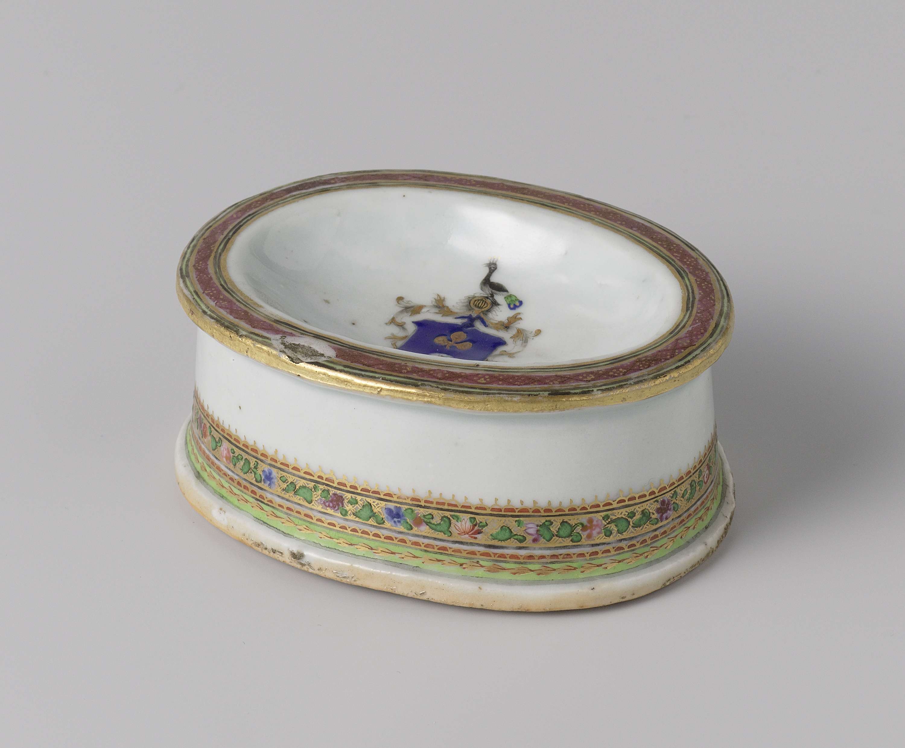 Ovaal zoutvat beschilderd in emails en goud met het wapen van de familie Van Idsinga en smalle decoratieve banden. (Nederlands)