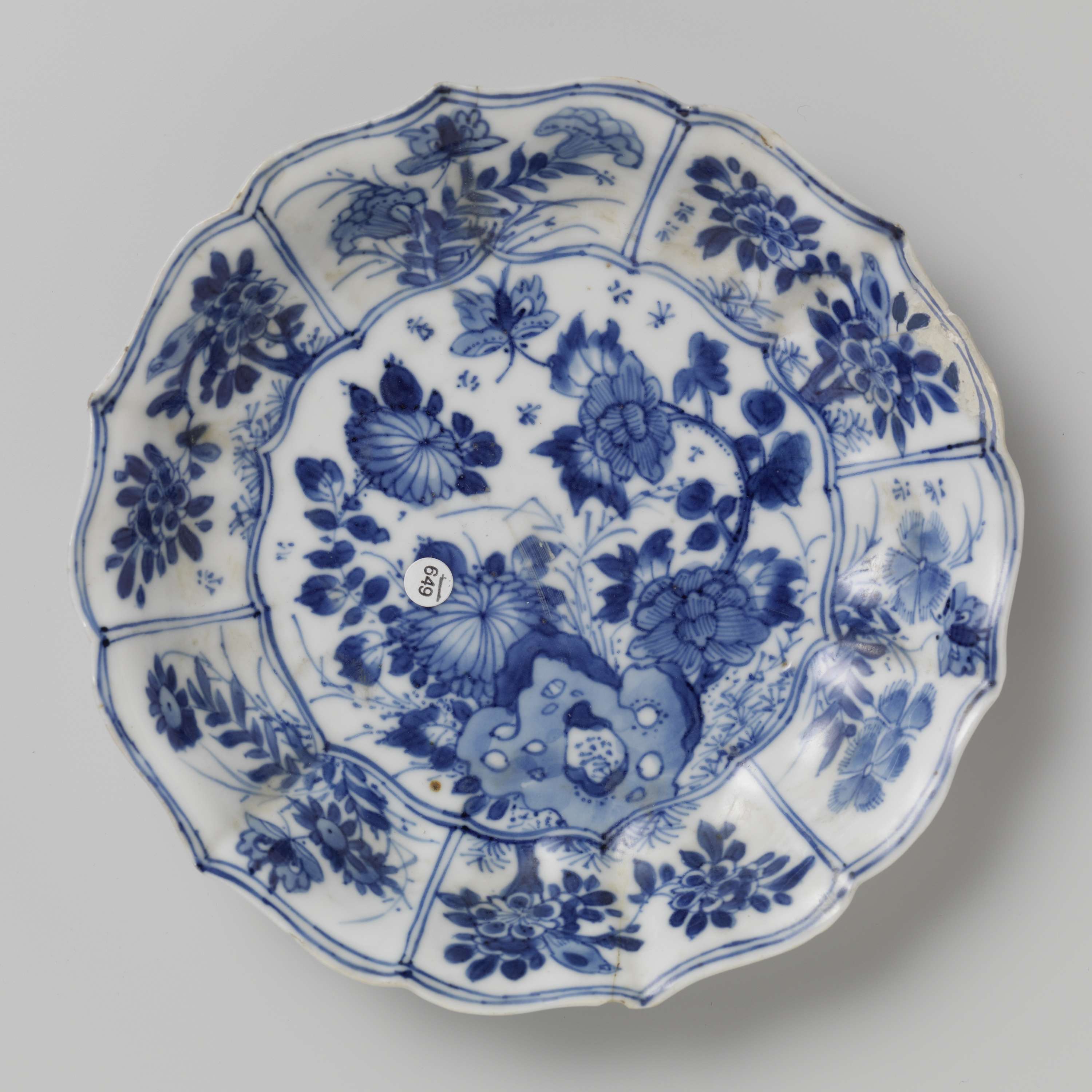 Schotel van porselein met geribde wand en geschulpte rand, beschilderd in onderglazuur blauw. Op het plat een rots met twee bloemtakken (pioen, chrysant), een vlinder en insecten; de wand verdeeld in zes vakken gevuld met bloemtakken, vlinders en vogels; op de achterzijde drie bloemtakken. Gemerkt op de onderzijde met het karakter 'Fú' in een dubbele cirkel. Drie barsten in de wand. Blauw-wit. (Nederlands)