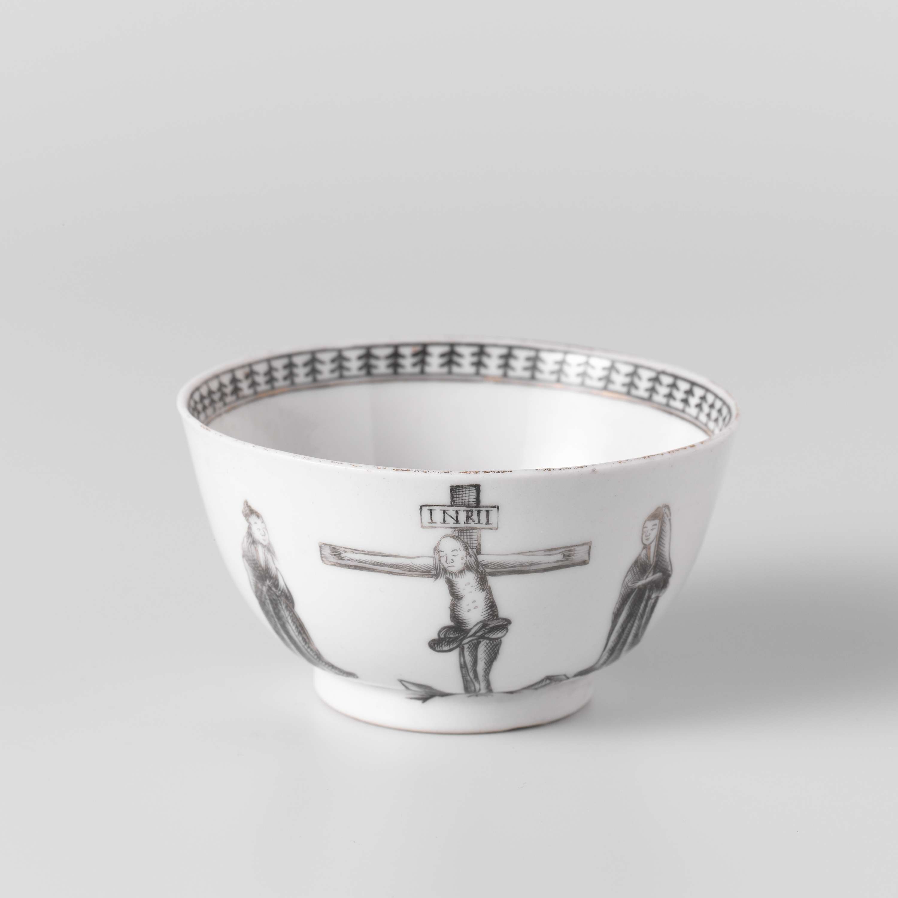 Klokvormige kop van porselein met een rechte wand, beschilderd op het glazuur in zwart en goud. Op de buitenzijde twee keer een voorstelling van de Kruisiging met de twee Maria's; de bodem met een twijg; op de binnenrand een band met een decoratief patroon. Onderdeel van een theeservies. Europese voorstelling in encre de Chine. (Nederlands)