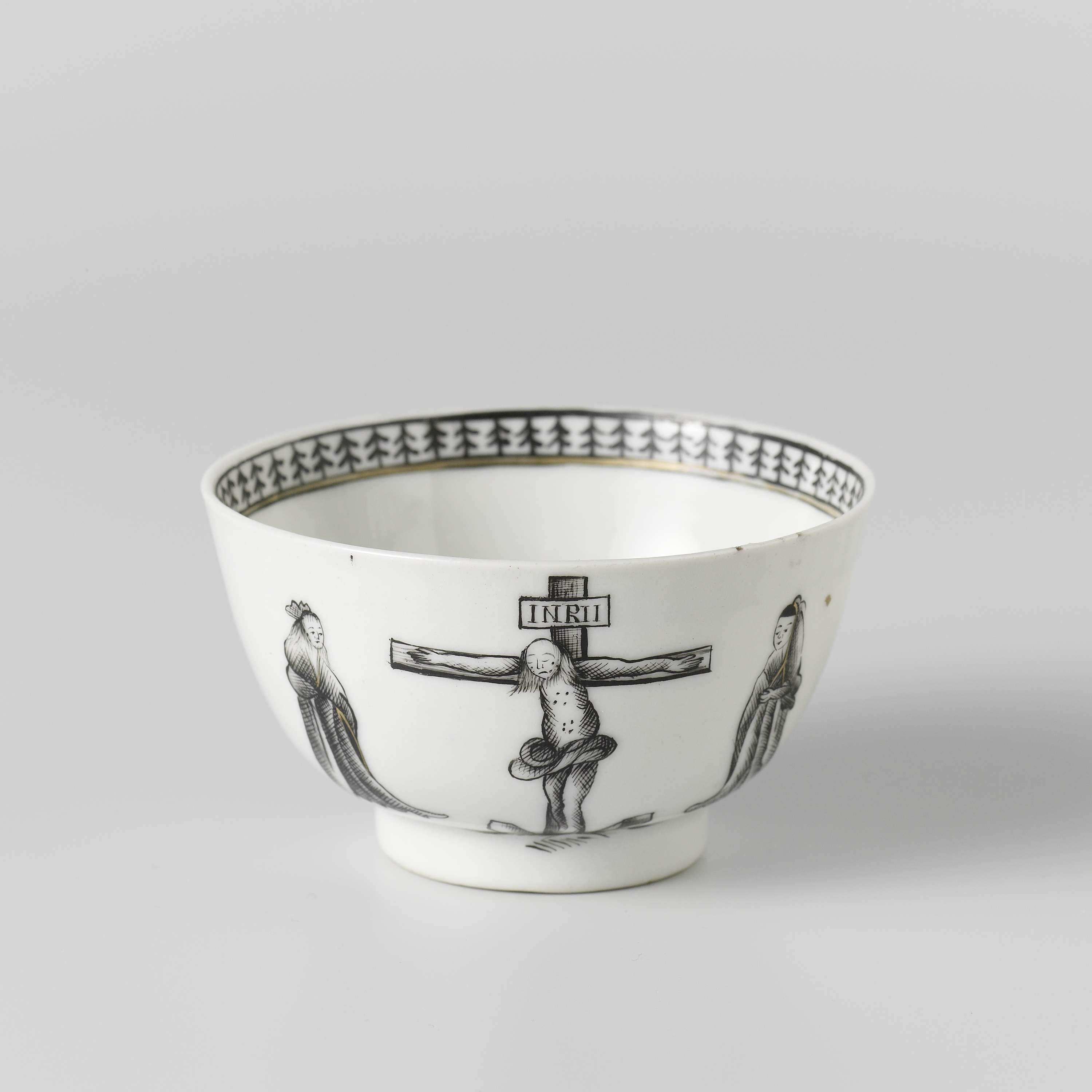Klokvormige kop van porselein met een rechte wand, beschilderd op het glazuur in zwart en goud. Op de buitenzijde twee keer een voorstelling van de Kruisiging met de twee Maria's; de bodem met een twijg; op de binnenrand een band met een decoratief patroon. Onderdeel van een theeservies. Europese voorstelling in encre de Chine. (Nederlands)