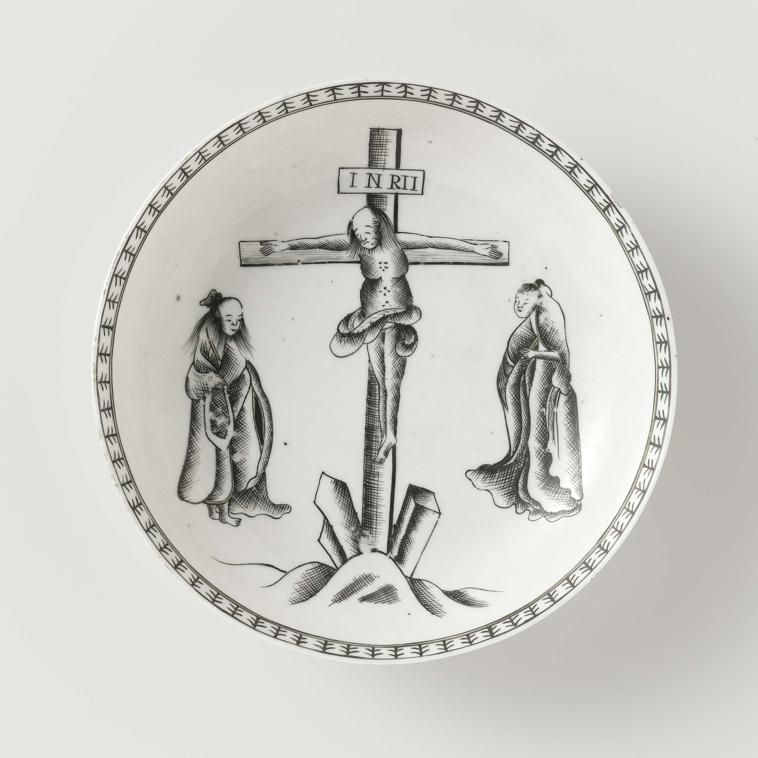 Schotel, gedecoreerd in encre de Chine en goud met een voorstelling van de Kruisiging. Behorend tot theeservies. (Nederlands)