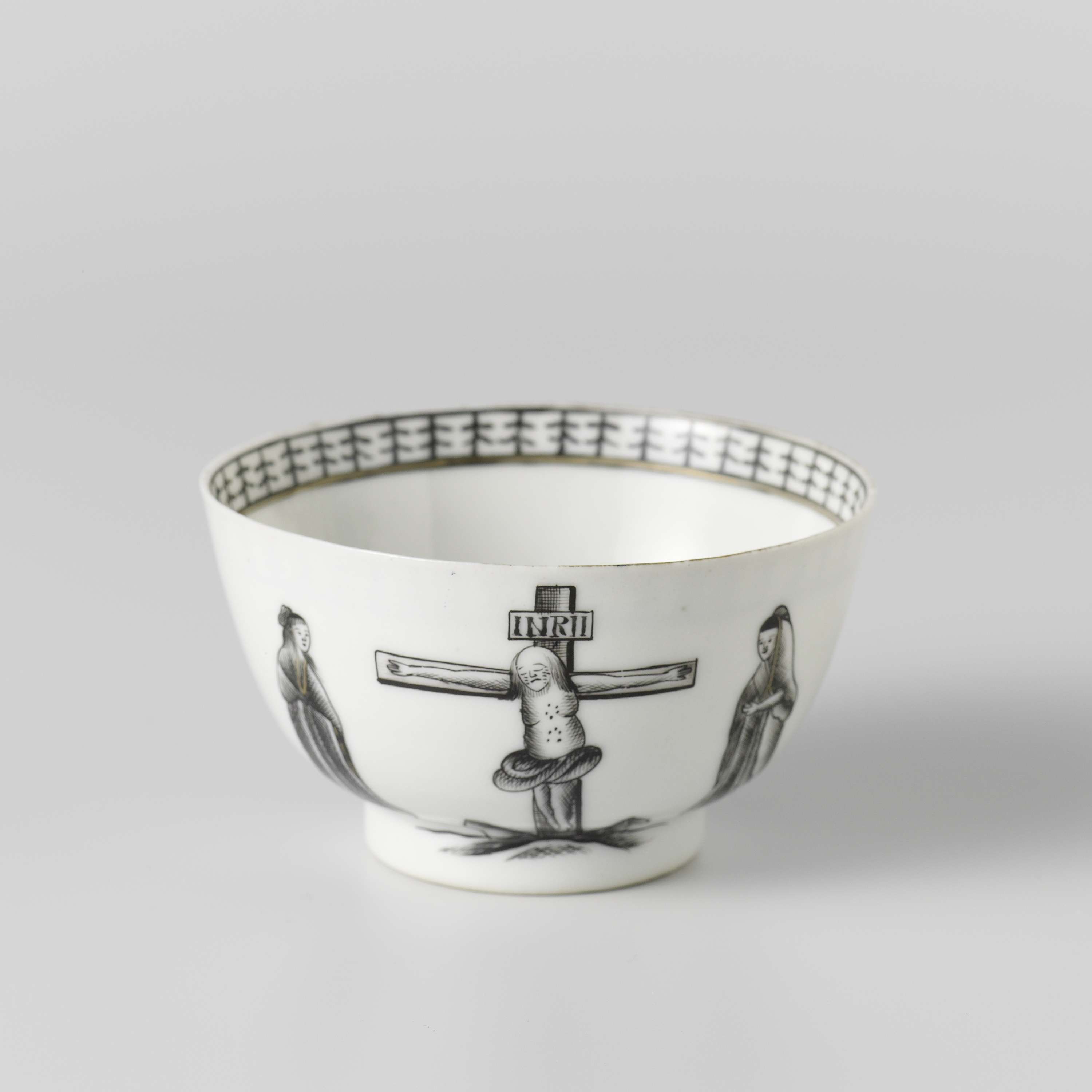 Klokvormige kop van porselein met een rechte wand, beschilderd op het glazuur in zwart en goud. Op de buitenzijde twee keer een voorstelling van de Kruisiging met de twee Maria's; de bodem met een twijg; op de binnenrand een band met een decoratief patroon. Onderdeel van een theeservies. Europese voorstelling in encre de Chine. (Nederlands)