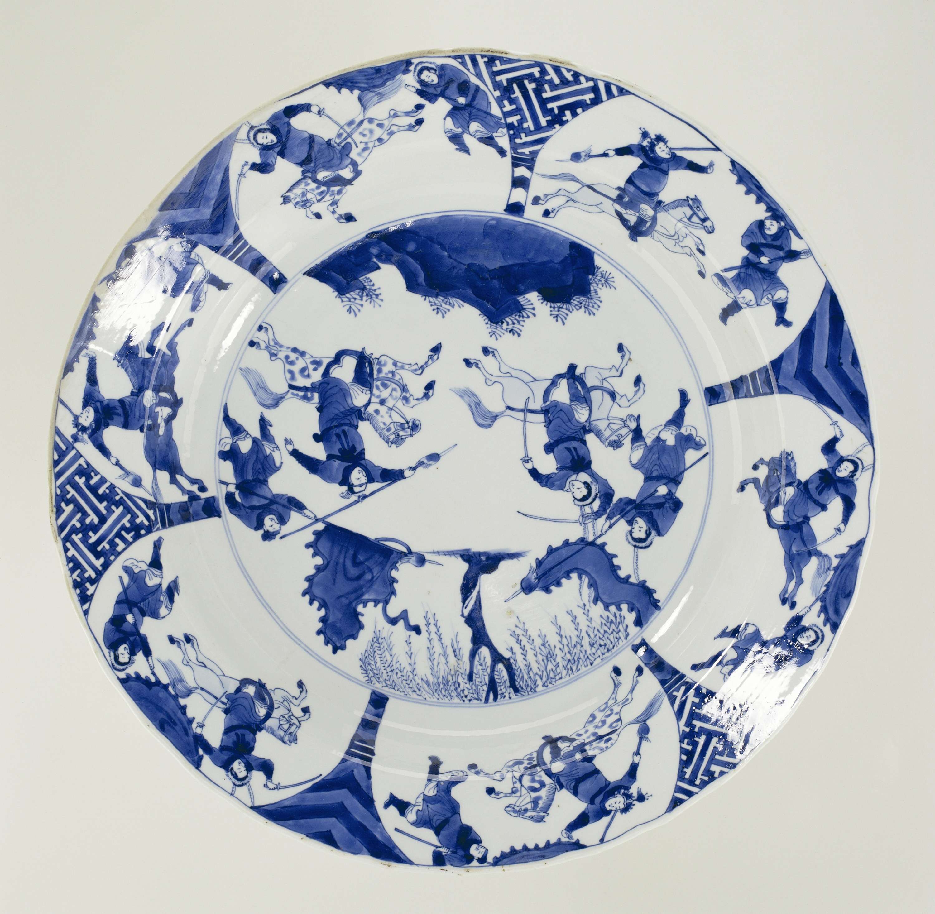 Schotel van porselein, beschilderd in onderglazuur blauw. Op het plat vier krijgers, waarvan twee te paard en twee met vaandels, in een landschap met rotsen en een boom (wilg). Op de wand en rand zes bloembladvormige cartouches, uitstralend vanuit het plat met in elk twee krijgers. Tussen de cartouches een swastika-patroon of blauwe lijnen. De buitenrand met vier bloemtakken (pioen, lotus, chrysant). De buitenwand is verdeeld in zes vakken met een ruyi-motief. Dit bord toont de liefdesgeschiedenis van Xue Dingshan en Fan Lihua. Xue was een generaal uit de Tang-dynastie (618-907), Fan was de dochter van een generaal van een vijandelijke staat, Xiliang. Hier worden ze verliefd op het slagveld. Door misverstanden trouwen en scheiden ze twee keer, maar uiteindelijk leefden ze nog lang en gelukkig. Gemerkt op de onderzijde met het zes-karaktermerk van keizer Chenghua in een dubbele cirkel. Blauw-wit. (Nederlands)