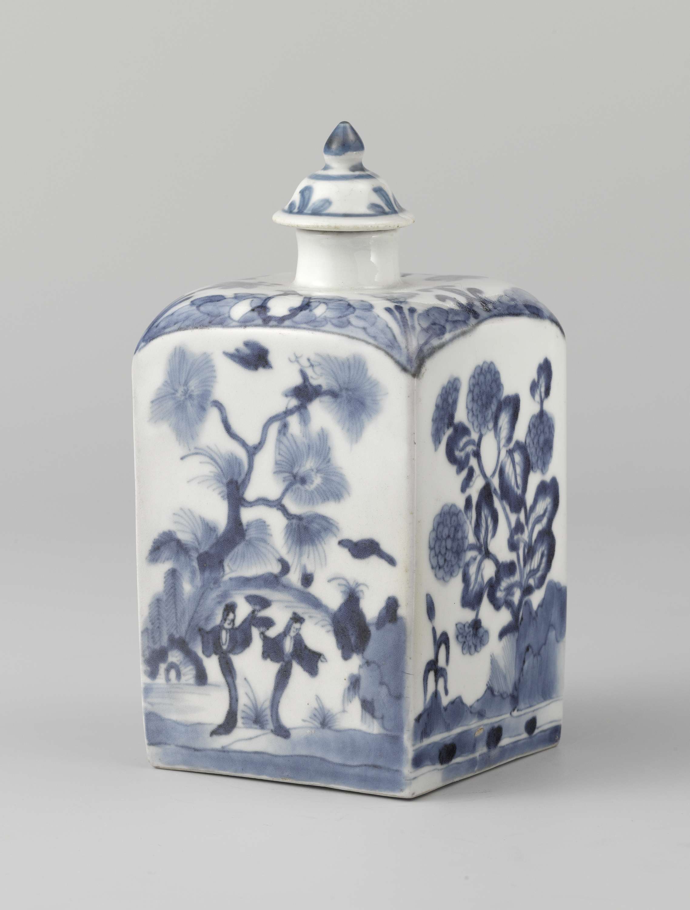 Vierkante fles van porselein, beschilderd in onderglazuur blauw. Op de wand vier verschillende voorstellingen: één met twee vrouwen met een waaier in een landschap voor een grote boom met twee vogels, een bloemenvaas met daarop een vrouw met een waaier, een bloeiende chrysant bij rotsen en een waterdrager bij een huis en een grote boom met een vogel. De schouder met bloemranken. De deksel met drie takken is niet bijpassend. Een chip in de rand van de fles en de deksel. Arita, blauw-wit. (Nederlands)