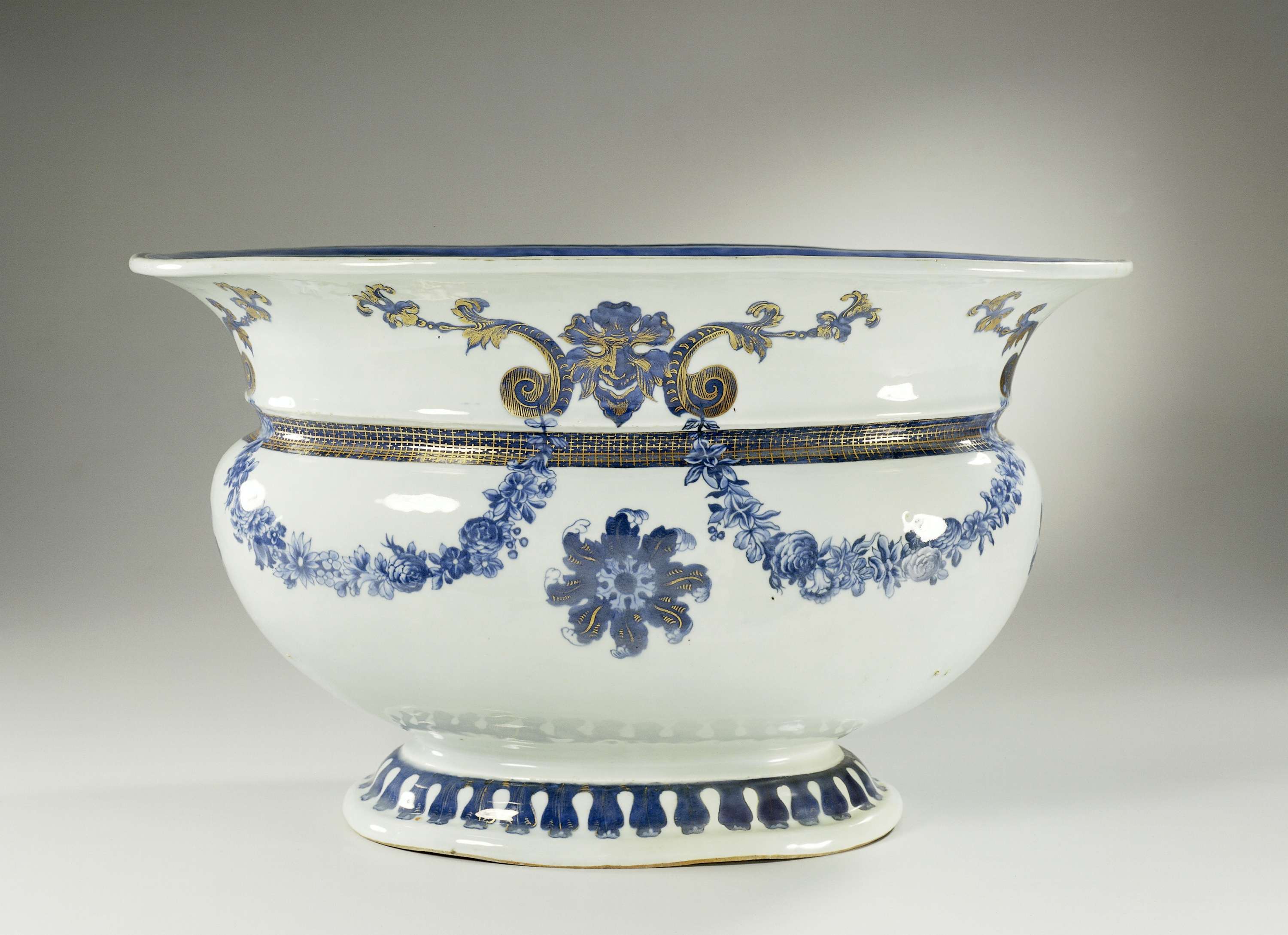 Ovaal waterbekken van porselein, beschilderd in onderglazuur blauw en op het glazuur goud. Op de buitenrand vier gestileerde maskers met aan weerszijden krulwerk en ranken, de maskers zijn verbonden door guirlandes over de buik; tussen de guirlandes telkens een bloemrozet; onder de maskers een band met een decoratief patroon; de binnenwand met vier grote pioentakken en vlinders; de binnenrand met zes vlinders; rond de voet een band met afhangende bladeren. Europese voorstelling in blauw-wit. (Nederlands)