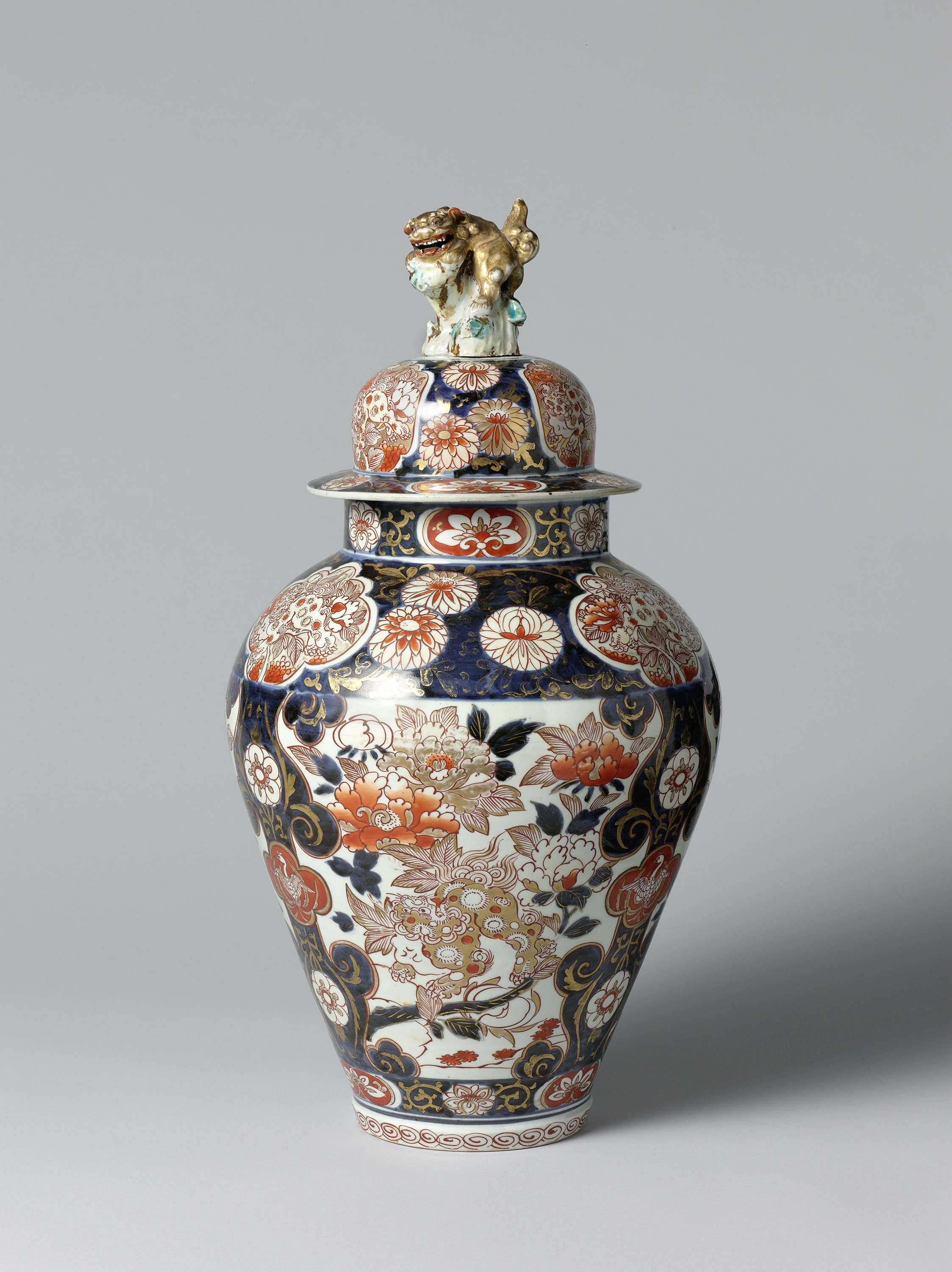 Balustervormige dekselpot van porselein, beschilderd in onderglazuur blauw en op het glazuur rood, zwart en goud. Op de buik drie grote cartouches met een shishi (leeuwhond) tussen een bloeiende pioenplant; de cartouches zijn gescheiden door banden van krulwerk met daarin een gelobd cartouche met een hoo-vogel omgeven door bloemranken. Op de schouder een brede band met chrysantranken onderbroken door gelobde cartouches met een shishi tussen een plant. Rond de voet en op de nek een band met lotusranken. Op de voet een band met krulwerk. De deksel met dezelfde decoratie; dekselknop in de vorm van een shishi op een rots. Maakt onderdeel uit van een kaststel. Imari. (Nederlands)