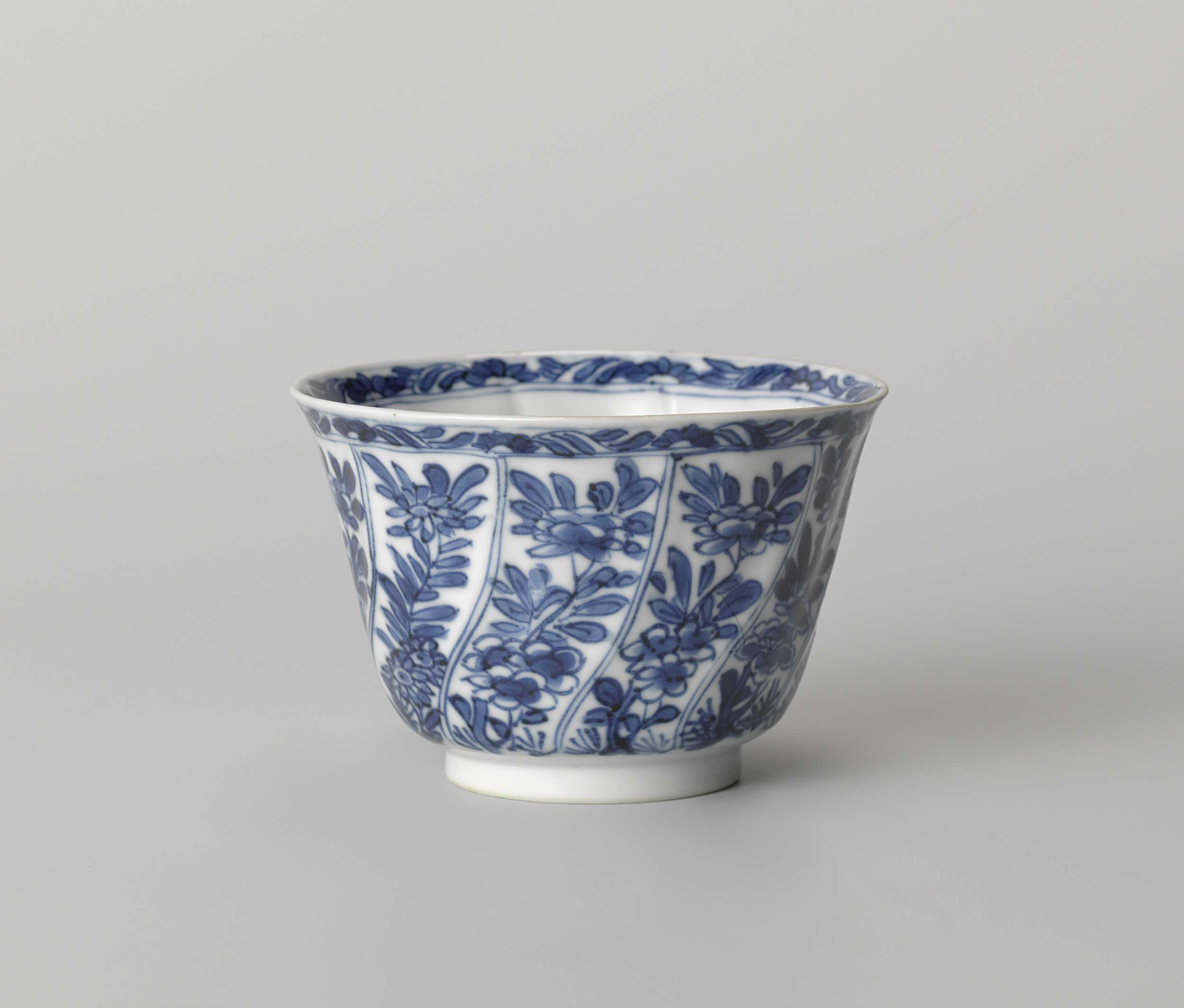 Kop van porselein met de wand gemodelleerd in getordeerde vakken, beschilderd in onderglazuur blauw. De wand met getordeerde vakken met bloemtak; op de bodem een medaillon met bloemtak; de binnenzijde van de rand een band met bloemranken. Gemerkt op de onderzijde met het Chinese karakter 'Fú' in een dubbele cirkel. Blauw-wit. (Nederlands)