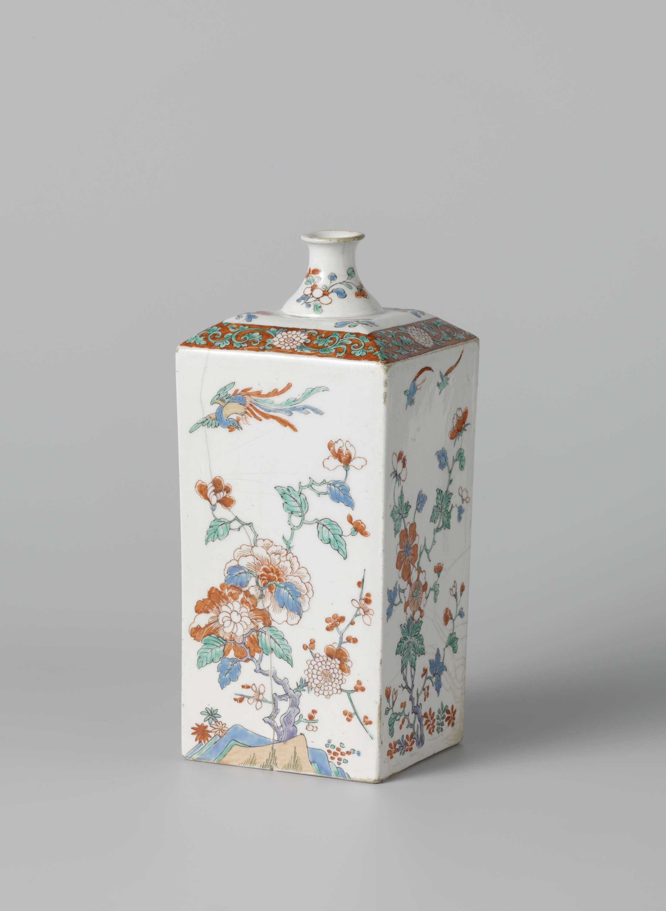 Vierkante fles van porselein met een korte, smalle, spreidende hals, beschilderd op het glazuur in blauw, rood, groen, zwart en goud. Op twee zijdes een pioen en prunus bij een rots met een hoo-vogel; op de andere twee zijdes een bloeiende plant en twee vogels. Op de schouder bloemtakken en een chrysantrank. De nek met twee bloemtakken. Kakiemon. (Nederlands)