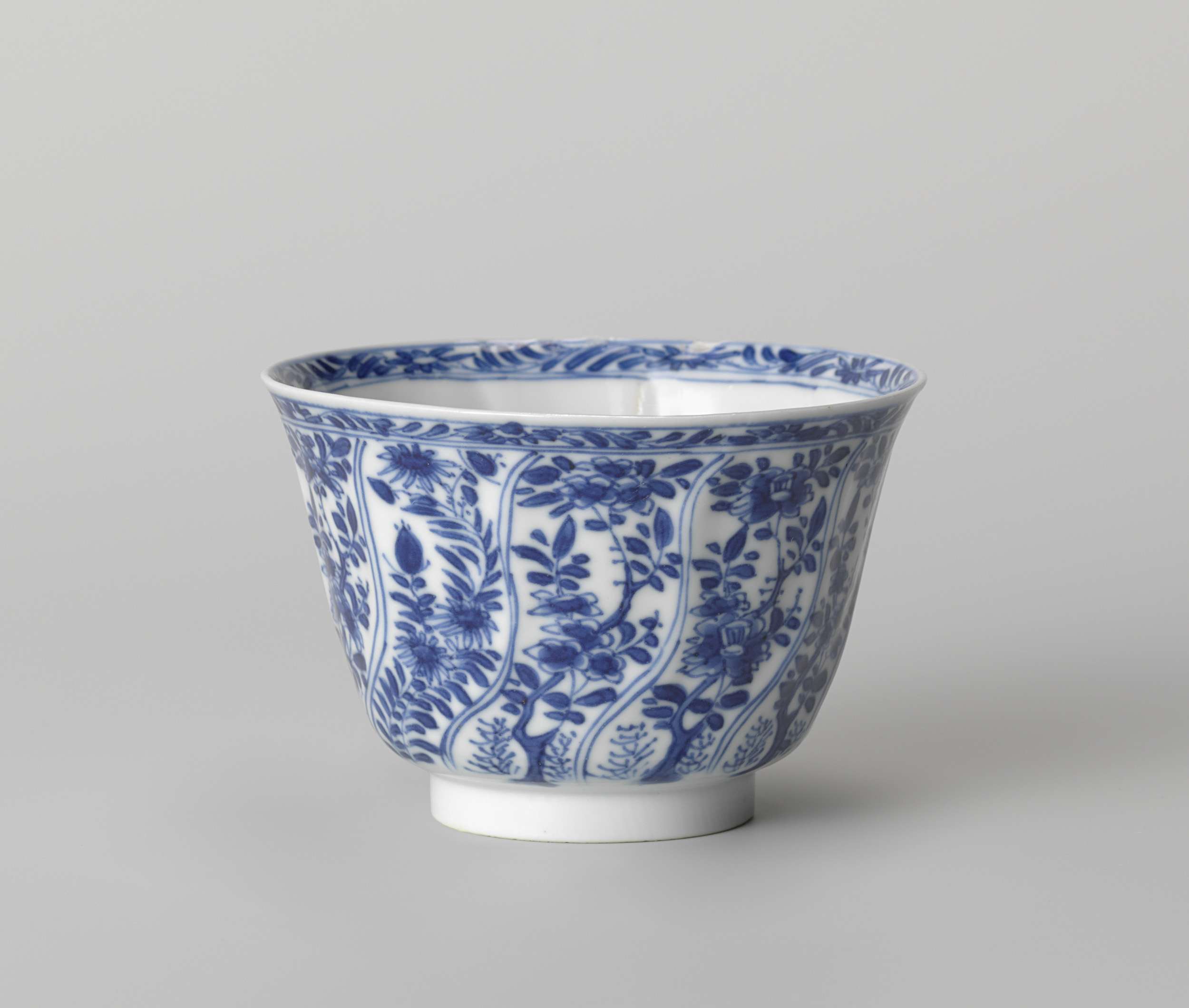 Kop van porselein met de wand gemodelleerd in getordeerde vakken, beschilderd in onderglazuur blauw. De wand met getordeerde vakken met bloemtak; op de bodem een medaillon met bloemtak; de binnenzijde van de rand een band met bloemranken. Gemerkt op de onderzijde met het Chinese karakter 'Fú' in een dubbele cirkel. Blauw-wit. (Nederlands)